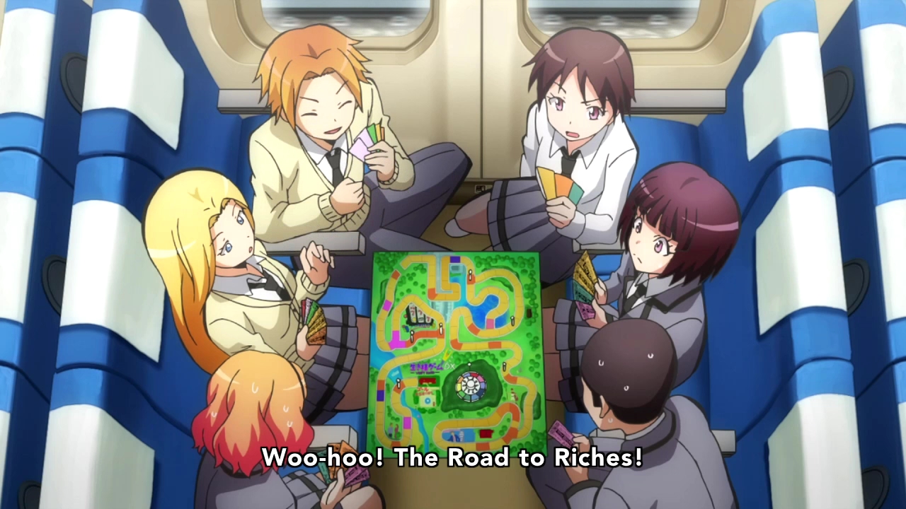 What a fun trip. Well, the kids get into groups of 6, and we focus on our “main” group, consisting of Nagisa, Karma, green-haired girl, Okada, other boy, and the idol girl, Kanzaki. (it’s going to take me awhile to remember their names). Koro-sensei makes them all a guide for their trip, which he’s super excited about, but the book looks more like an encyclopedia than an actual guide. Well, no one wants to carry it around so Kanzaki makes an itinerary herself. When they were on the train, Kanzaki and the girls bump into some guys, and one of them picks up her itinerary, and we know problems are going to arise later.