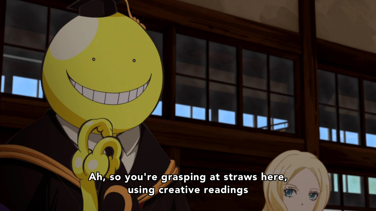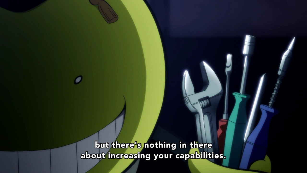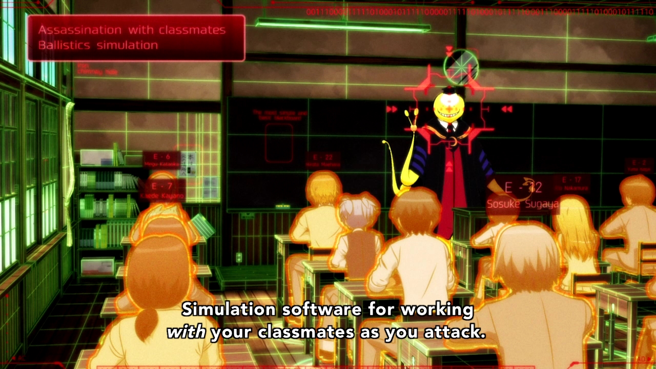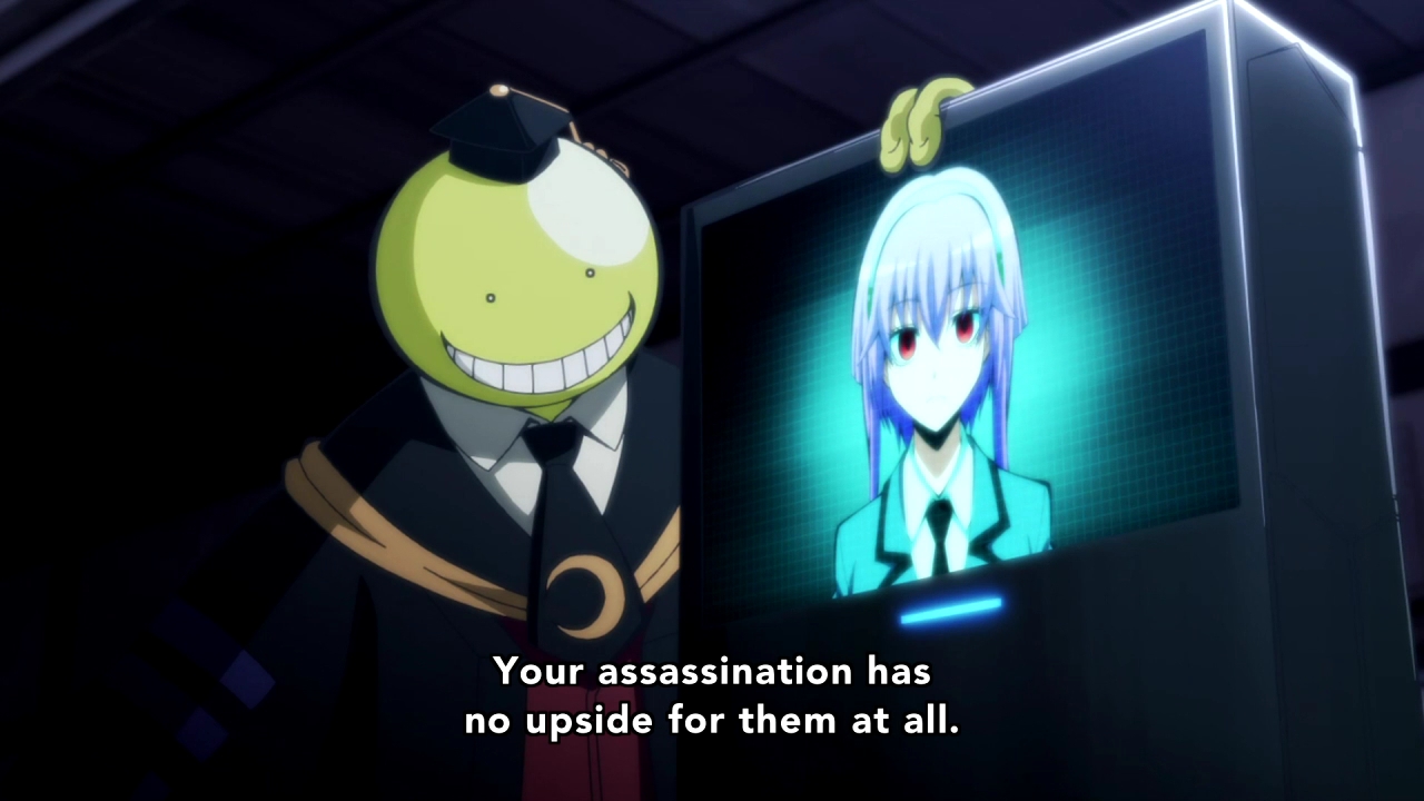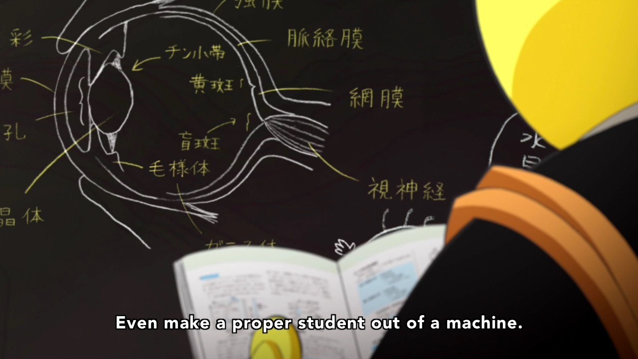 Because she distracts them from her learning, and frankly none of them really like her. During the night, she processes data while also being paid a visit by Koro-sensei. And as usual from Koro-sensei, he can even reach out to the heart of a robot. But she’s a student nonetheless. He can’t harm her, so he can’t destroy the machine, but they never said anything about changing her memory and such. He explains to her why the students put restraints on her, and how if she doesn’t get along and understand the students, she won’t get anywhere. She needs to take into consideration their feelings. Also, if she were to kill him, the billions would probably just go to the men that built her and not be shared among the students.