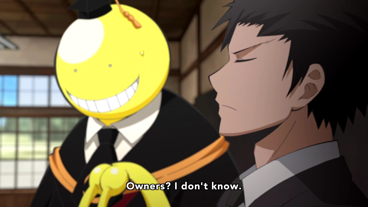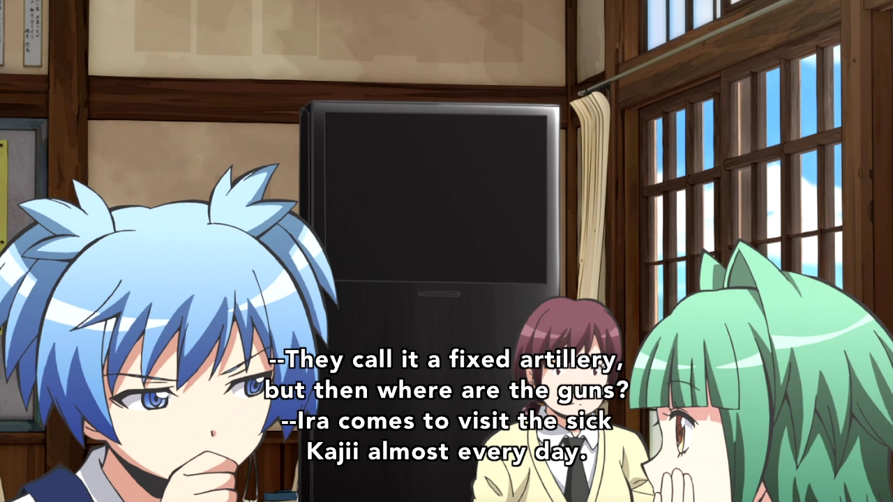 That same night, the men that built her pay a visit and are appalled at the upgrades made and try to fix her, deleting the things that don’t have to do with assassination. Obviously, all these men care about is money and they’ll do whatever to get it. The next day, we see Ritsu as she was the first day she arrived, Karasuma announcing that upgrading her is the same as “harming” her, so Koro-sensei has to back off. The class is worried that the same barrage of bullets is going to happen again, but it turns out that Ritsu disobeyed her master and saved some of the data she deemed having to do with assassination, and kept them somewhere where they couldn’t find it. She retains the same personality and so she officially joins the class.