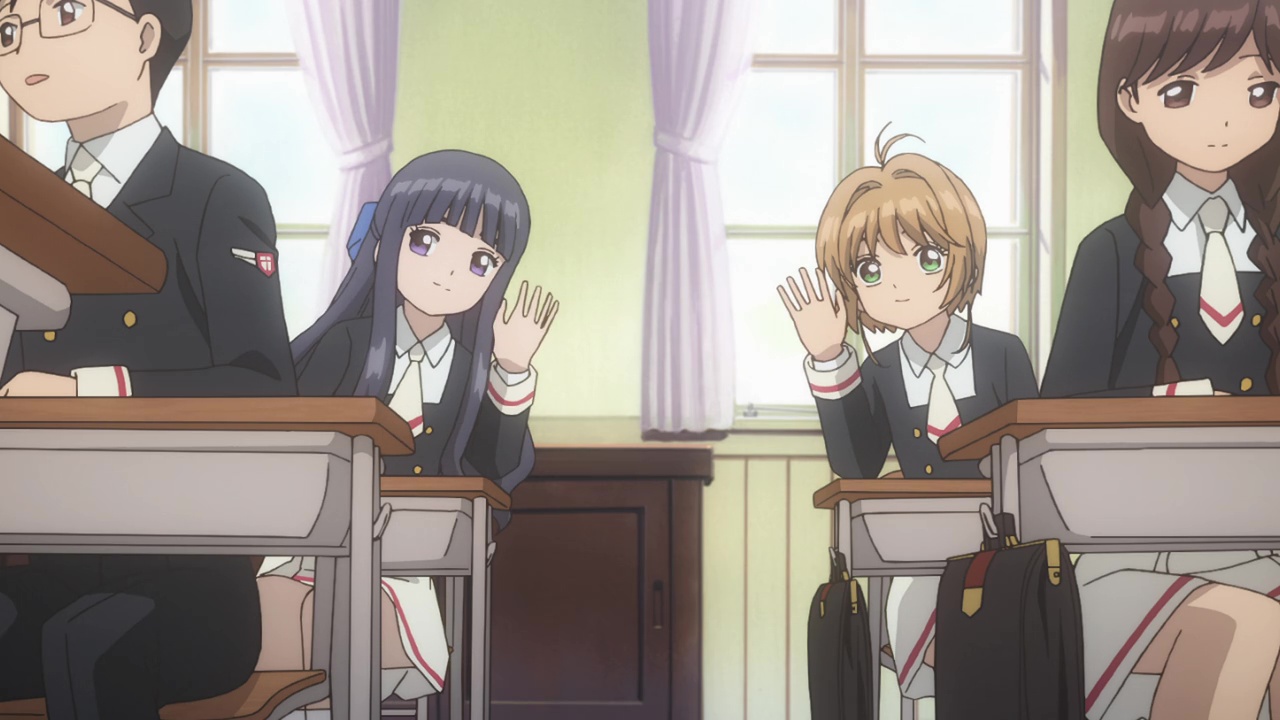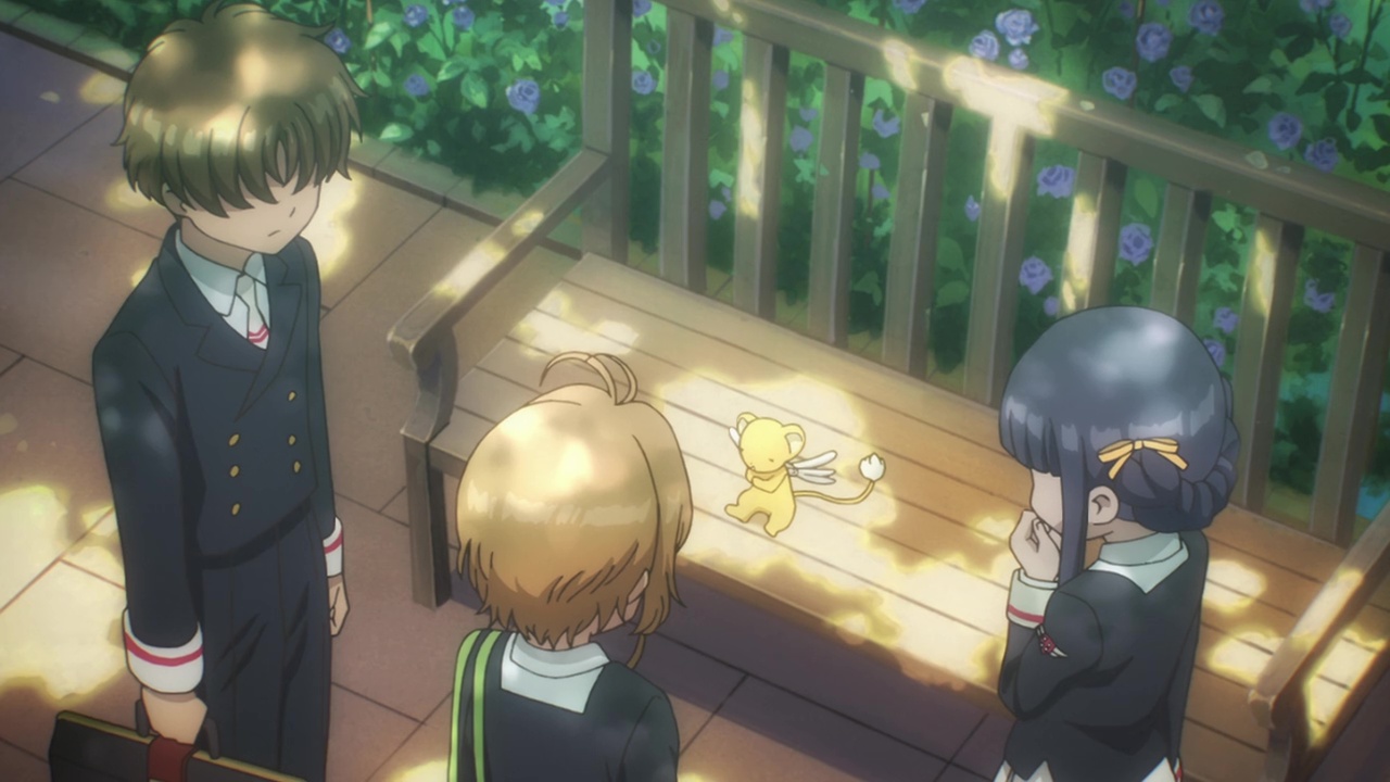 Later at school Sakura fills Syaoran and Tomoyo in on what’s going on with her Clow cards. Kero shares that he’s already e-mailed Eriol in England and is waiting for a reply. With nothing else to do, the three return to their classes and finish their day at school.