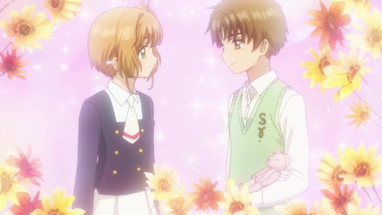 In this first episode, Sakura goes to her first day of middle school.. Sakura learns quick that some of her middle school subjects are going to be much harder for her now (specifically shown are math and English). On her way home she bumps into Syaoran, who has returned from Hong Kong at long last. They have a sappy reunion, one which Tomoyo interrupts with her sneaky cockblocking antics as always. ;D   Some things never change.