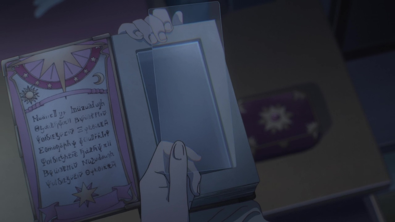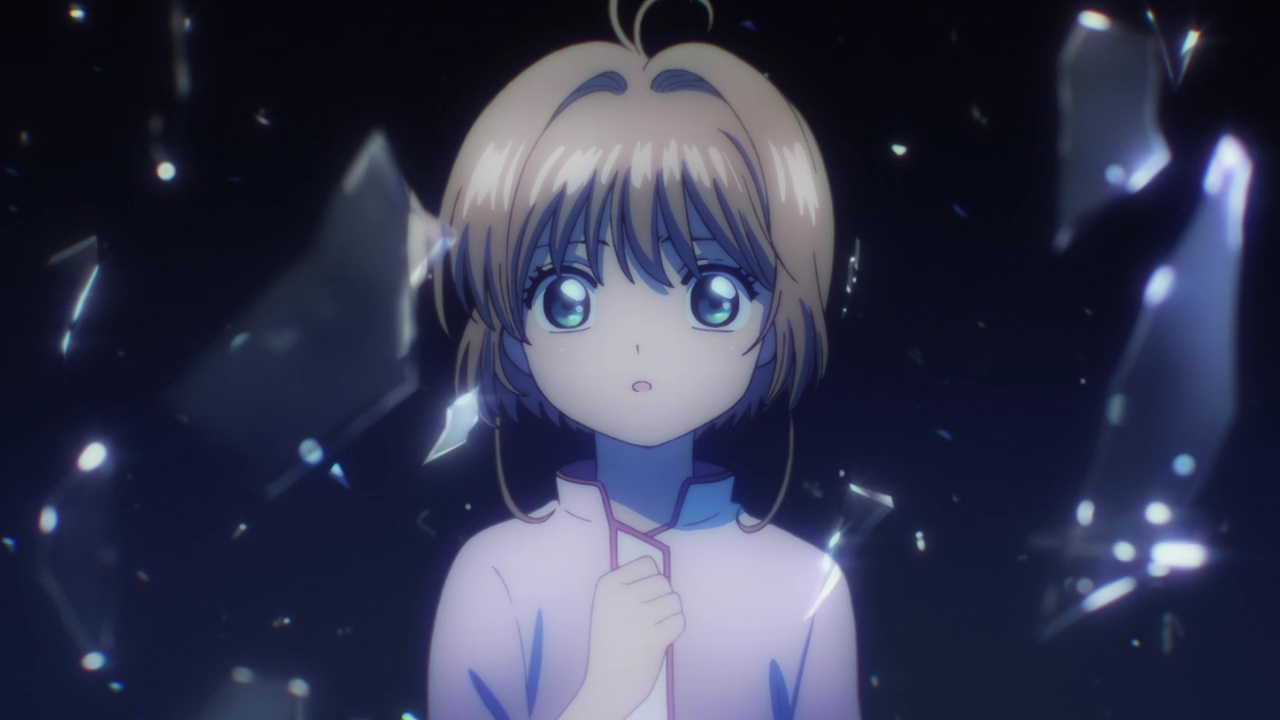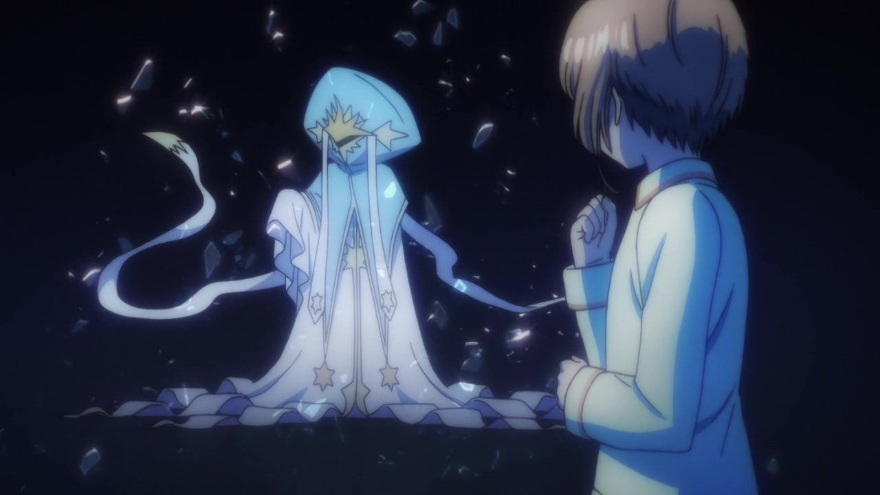 That night Sakura has a nightmare in which all her Clow cards have turned clear. There is an unknown figure floating a distance away from her, and she cannot make out the individual’s face or body as they are wearing some kind of hood or mask that covers everything but their (shadowed) eyes. This person makes Sakura’s cards shatter and the broken pieces go racing towards her body. When Sakura is jolted awake, she rushes to open her Clow book and sees that her cards have indeed all turned clear.