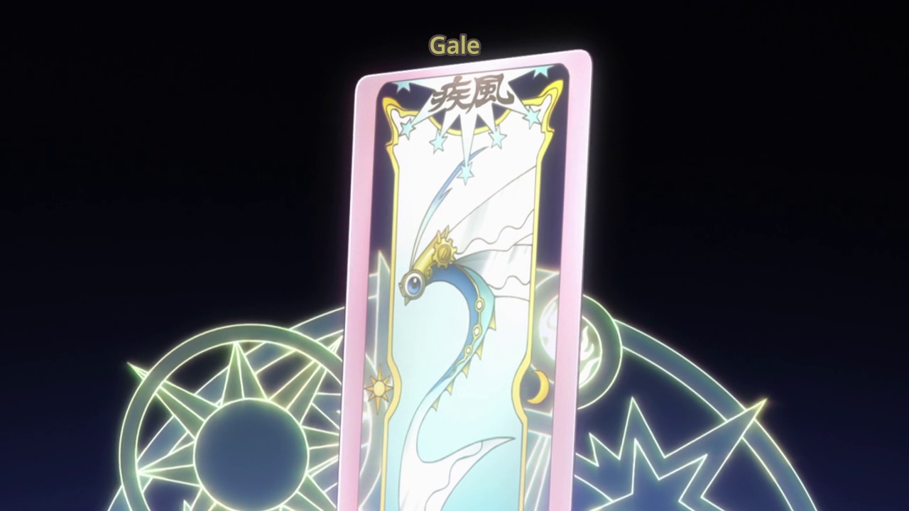 While walking to school the next day, Sakura and Kero are attacked by what is obviously some kind of wild Clow card. It has the power to rip gashes in the sidewalk and rip a tree down, so it looks pretty powerful. It attacks Sakura a during a vulnerable moment and she is saved at the last moment by her new Clow key, which transforms into a fancy new staff. Her new incantation magically comes to mind and Sakura is able to seal the new card: Gale.