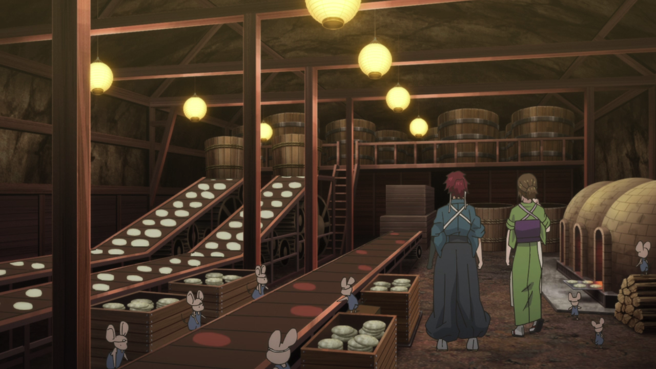 We learned more about what runs behind the scenes of the Tenjin-ya Inn. In the basement is the delicacy production, overseen by the Tesso, that Aoi initially freaked out over thinking they were being worked like slaves until she saw they were all good. There was the lab where Dr. Saraku (Director of Developments) is always trying to think of new ideas and the storage and so on, and apparently the offices as well, where Nobu had eventually led Aoi to what appeared to be Oodanna’s office, where there she encountered some very interesting photographs.