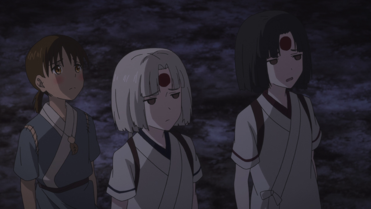 Also can we take a moment and talk about Umi Bouzu, because holy smokes that entrance from the ocean was hella creepy. It blows my mind how this guy got this enormous and terrifying body that was seen in the ocean, once it settles onto the island for the ceremony, it seems to shrink significantly. Just like Aoi, I was shocked by how tiny Umi Bouzu’s hands were! I wonder if Umi Bouzu breaks down into a bunch of small “people” (for the lack of a better word), which might explain the tiny hands and perhaps why Aoi freaks out.