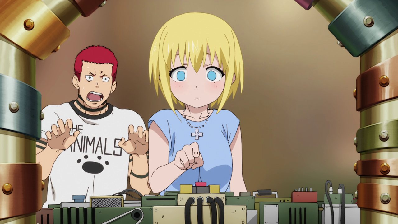 Pushing the suspicious scientist to the side for now, the episode mostly focuses on recruiting more members to the 8th. They’ve set their eyes on finding a mechanic as to give Hinawa some relief from those duties and expand on what the 8th can do. It is interesting to note that they did hint at possibly finding a mechanic earlier on in the series when Obi apologized to Hinawa for having to deal with that task despite it not being his job. In any case, seems the 8th is trying to recruit a specific mechanic named Vulcan and sent Shinra, Arthur and Iris to go see if this Vulcan guy is a good fit for the 8th. However, it wasn’t going to be an easy task as Vulcan had turned down all previous offers from other fire forces and has a distinct dislike towards the Fire Force and Haijima.