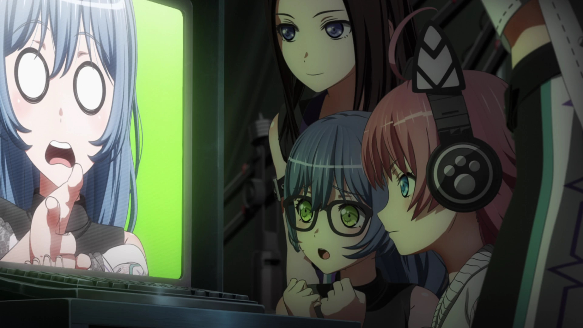 This was a very fun episode and I loved every second of it. Even though Rokka is a temporary guitarist, she still needs to work hard since she’s technically part of the band and start practice early. She’s greeted by Pareo and is immediately fitted for her costume, which was actually the same outfit that Tae wore but made with some adjustments. The coolest and most exciting part of the episode however was the making of the music video. Since Chu2 has amazing connections because of her parents both being part of the music industry, she booked an amazing studio to help them make their music video for their new song, Expose burn out!!! It was pretty interesting seeing them do this part as there were lots of cool special effects and props, such as the gun finger thing. Which turned out to be funny because of Rokka freaking out and not really knowing what to do. And…you can’t really blame her. But they all did a pretty fantastic job and they had really cool costumes as well. This was also a pretty good episode for us to see the ladies bond. The little moment during their lunch was nice. We learned Pareo was the first one to join RAS, and that Layer and Masking joined around the same time. And they knew each other because they saw each other once in awhile during their music wandering days. Of course of them all, Pareo has the closest relationship with Chu2 and I wonder where and how they met because their relationship is pretty special. That’s probably the bond I’m most intrigued with. Layer had a cute moment with the octopus sausages, and it’s small but it’s nice to see them bond and be a little lighthearted and silly considering how serious the band is, mostly because of Chu2. We’re finally getting a chance to get to know the girls more and so far I’m loving it. And it doesn’t stop there.