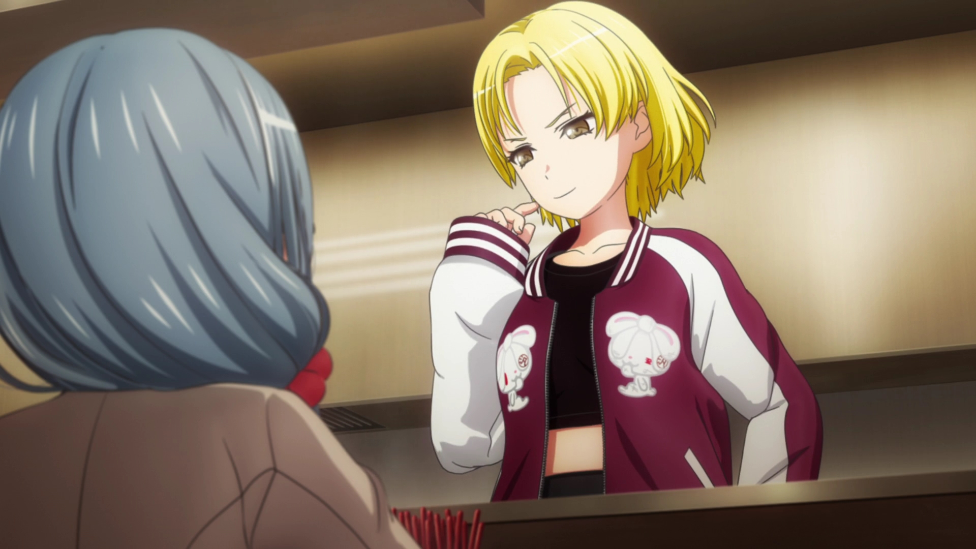 As intimidating as Masking looks, she’s an incredibly kind and sweet person. She may be wild but she loves music, and she cares about people. Like I said, I loved this moment. Their friendship is so cute, but again I wish Layer was there too to give her support. I think she and Rokka can also have a nice friendship too. I think Rokka still has some reservations with Chu2’s attitude and the whole “beat Popipa to a pulp” thing. Well, Layer is close friends with Tae. How does she feel about this? She could probably give Rokka some peace of mind about all this.