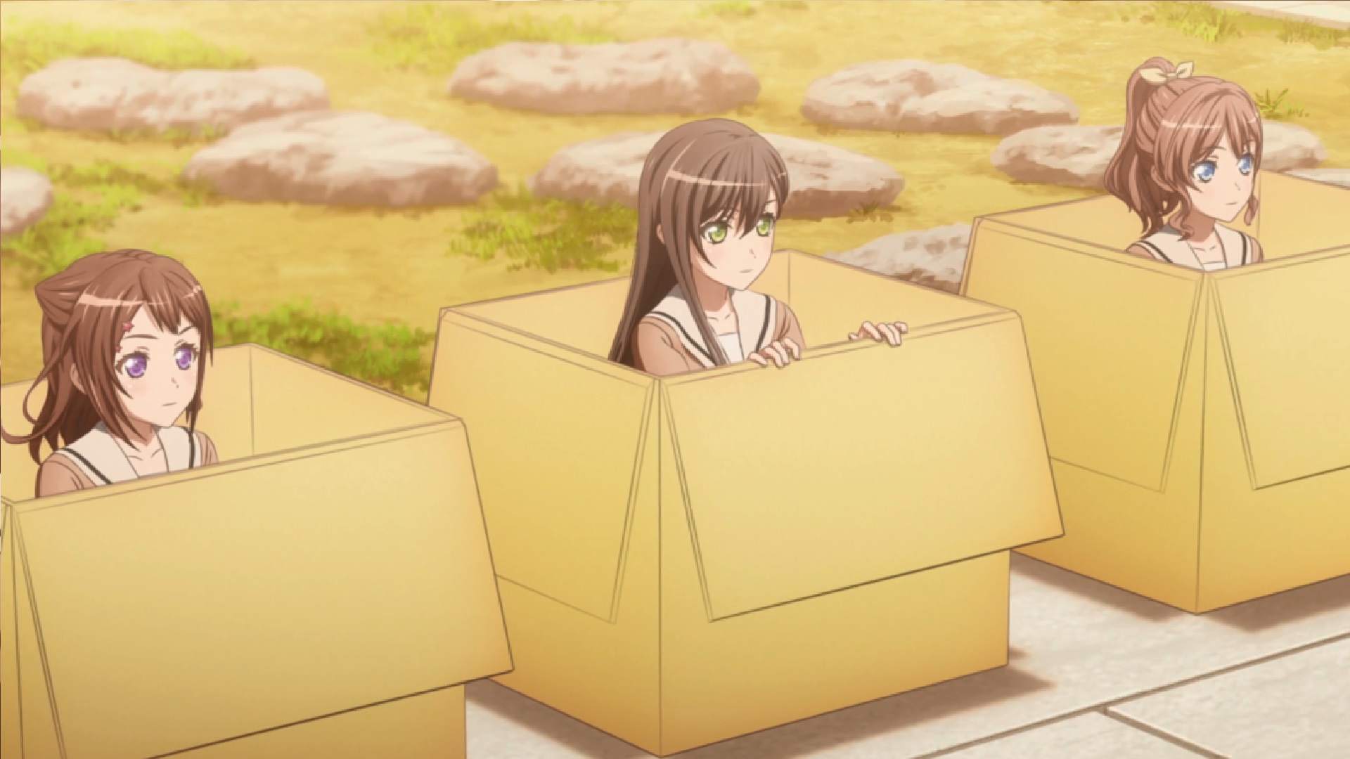 That means asking Rokka for a little help, and lots of cameos from the other bands! I thought it was really cool that Aya and Chisato explained the backstory to their MV of Luminous Once More. There were lots of cool callbacks to the game this episode, this just being one of them. Arisa called them over to ask about it and they explained how they filmed certain things and where the location was, while also sharing cute stories like Maya camouflaging into the green screen and Aya sleeping. And of course since they took a lot of inspiration from Expose burn out, Popipa tried including stuff into their MV like the finger guns and the boxes. And for some reason I found the whole cardboard box part so hilarious, I was really cracking up. That whole scene was hilarious though, along with the quick little snippet of Poppin Shuffle with the little bit of footage they had. The cardboard boxes, I swear…