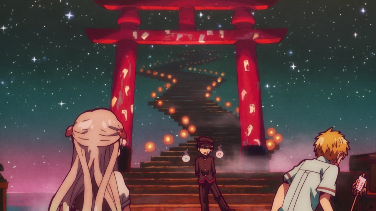 Yashiro goes to Hanako for help, and Kou comes crashing in yelling about students from his class suddenly disappearing and being forgotten as well and blaming it on Hanako. Hanako explains that there are several spots in the school that connects with the spirit world, and the stairs are just one of them. The students that step there are sent to the Boundary and when they do, their entire existence is then erased. But he says that he can save them, so they all head to the Misaki Stairs and enter the Boundary, which is a kind of trippy but beautiful place.