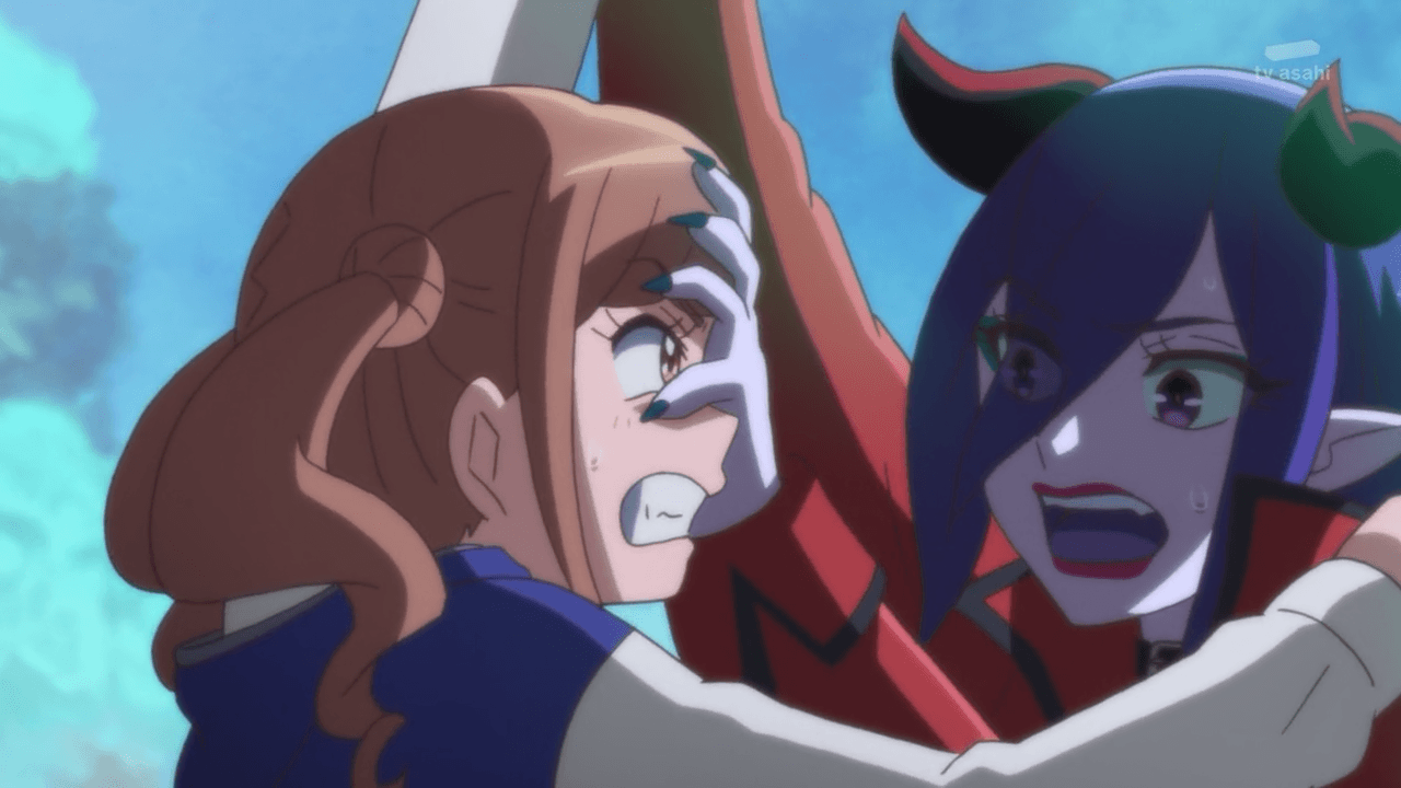 Best of all, we not only got to see how different she and Chiyu behave in general, but also in dire situations. When Pegitan was captured by Shindoine, Chiyu’s first thought was to attempt negotiation, while Hinata rashly threw her bag at Shindoine (only for Pegitan to get hit instead) and tackled her in attempt to get her to release him. Like damn girl, you didn’t stop to think how dangerous she is. Of course after all of that was said and done Chiyu (justifiably so) gave her a good scolding about it. I really liked that we had the opportunity to see how they would react in such situation, adding some more layer to the type of characters they are. It is also worth pointing out how Nodaka found herself in the more support role today. With the help of her mother (who had given her the tickets for them to go to the aquarium together), she was able to serve as a great middleman to help balance things out when it comes to misunderstandings and clearing up communications between the girls.