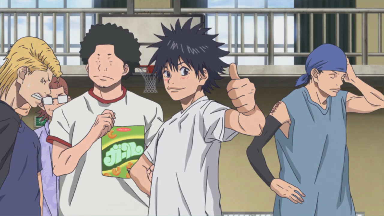 But on that note I think this is going to be a really engaging match, because I want to cheer for both of the teams competing. So where our team succeeds I’ll be really excited, but still feel bad for Shinjo and vice versa. I really do appreciate Shinjo’s captain making a comment about how everyone wants to go to the Inter-High, because it really puts into perspective that while we’ve only been watching our gang of delinquents work and build up their skills, all these other schools have been working their hardest as well. And for someone to acknowledge that? I think that’s really important. It’s generally implied in other anime, but hearing it out-loud is really refreshing. And immediately once Sora and the gang step on the court it seems like everyone starts to disregard them because they are full of misfits and delinquents. Yes! Half their team didn’t start playing basketball until very, very recently and another good portion played at one point, abandoned the sport, and came back. Kite and Sora have consistently played basketball (I mean! It shows, the team ultimately is built around those two!). But! They’re misfits who want to win!!