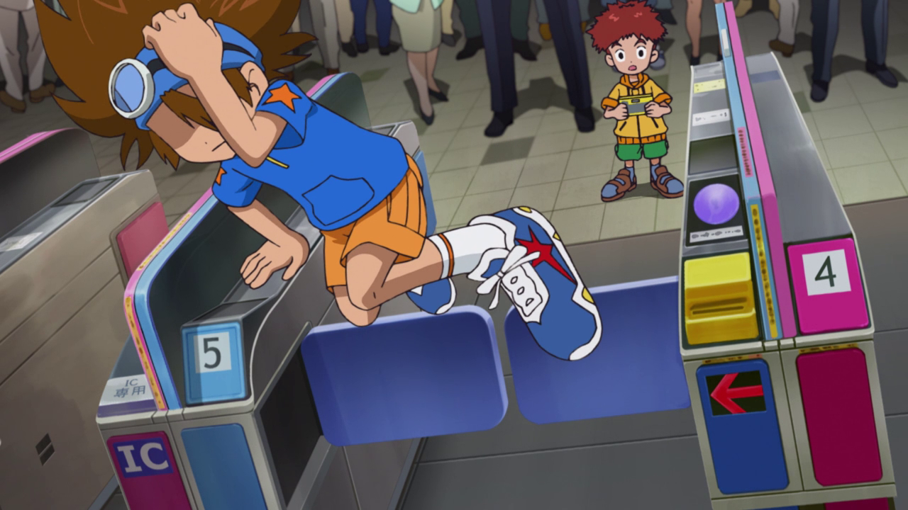 The mood of this episode went from pleasant and light-hearted to series REAL FAST. We first get to see Taichi packing for summer camp and then meet Iz- Koushiro, only for them to find out that electronics are going haywire in the city along with the train systems, which just so happens to be where Taichi’s mom and sister are. The scene where Taichi and Koushiro are at the train station and Taichi jumps the meter… that was such a good scene. I love how they didn’t tell you “it was because he had courage,” they just showed it with his soon to be crest pulsing in the background and the sheer determination he had to save his family. It was such as a great cinematic shot with foreshadowing and a great portrayal of character.
