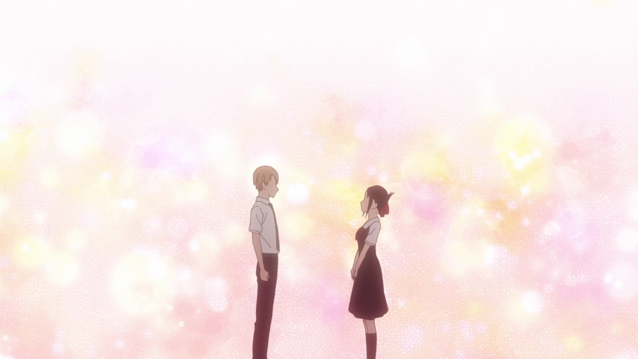 After three episodes of Kaguya just turning to jelly, we finally get to see Shirogane’s perspective on his feelings for Kaguya. I found it interesting of his true reasons to have Kaguya be the one to confess first. While yes, pride was a key factor as we all knew, but he also felt like they would be able to date as equals if she, a high status, confessed to him, a lower status. However, because of all the things they went through, Shirogane was willing to let go of his pride and confess right then and there to Kaguya… only to back out at the last second and tell her what he actually wanted to talk about. But I’m glad that he didn’t confess to her since I’d rather them confess to each other on their own terms rather than being forced into it… despite that being what the series has been striving for this entire time lol. Still, it was nice to see that he is willing to set aside his pride in order for them to be together… when the time is right. And it was mighty cute for Kaguya not to get angry over it and instead gave him a yes to “both things” which was very swoon worthy.