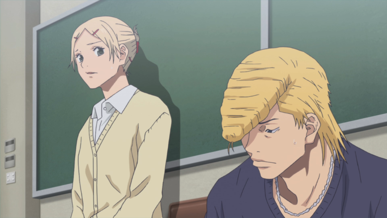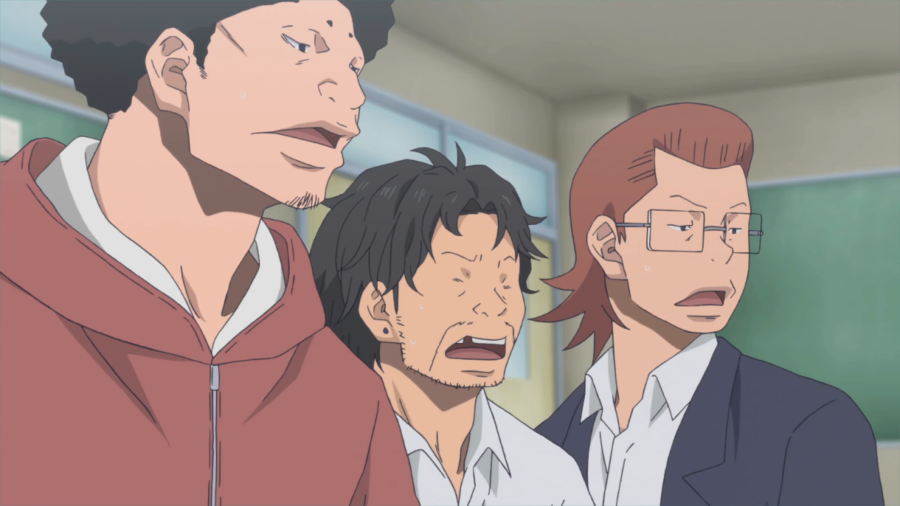 As usual with these last episodes, some things have been removed again: 1/ Censorship struck again (BTW, I think that this is due to the 6 p.m. airing time) as they removed a nice stylistic device of the author. Indeed, when the teachers are badmouthing the students, ironically, most of the teachers were themselves smoking in the office while criticizing. 2/ Again, poor Yasu has been removed. There was supposed to be a scene with him speaking with a man who’s probably his probation “adviser” (yeah bc it wasn’t really a joke when Chucky said that in episode 1). In that scene, he said that he didn’t really understand the problem as almost everyone around him smokes BUT when Satsuki said betrayal, that really hurt him.