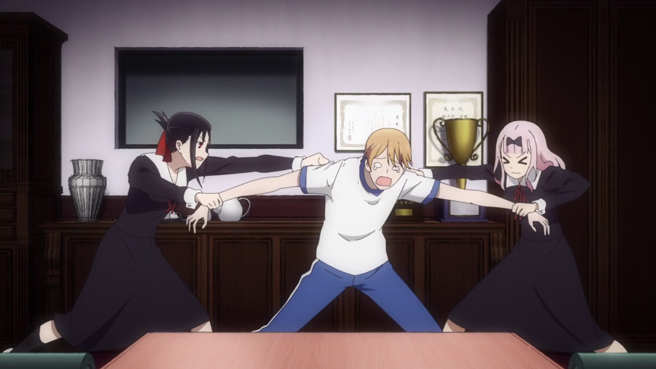 But then she has the gall to get jealous when she sees Kaguya take up the mantel to help teach him. Girl… DON’T GET MAD BECAUSE YOU GAVE UP IN THE FIRST PLACE. Not to mention she acted like he fired her but she’s the one who left him! He was trying to do this on his own after she left, but Kaguya turned up later and offered to help. So you can take your attitude and SHOVE IT, CHIKA. She was even acting like a backseat driver and was criticizing all of Kaguya’s tips so I was just done with Chika at that point. Though I will admit, I absolutely lost it when Shirogane got an epiphany from how the net feels in Soran when Kaguya and Chika started a tug of war for who would teach him. As long as Shirogane got what he needed, it all turned out well. Though I’m still kind of annoyed at Chika. =3=