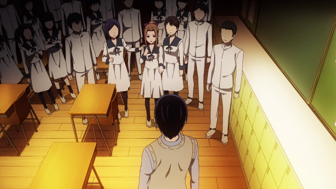 Okay, so I was right about the cheerleading squad at first in regards to them missing their eyes. It was definitely symbolic of how Ishigami was viewing people. Representative of him being unable to look certain people in the eye. When it showed that his classmate, someone he was able to look in the eye previously without eyes, it all clicked. Though I think it hurt the most when it showed him unable to look Shirogane and Kaguya in the eyes, the people he probably thought the most were his friends and the ones who always had his back when things were rough.