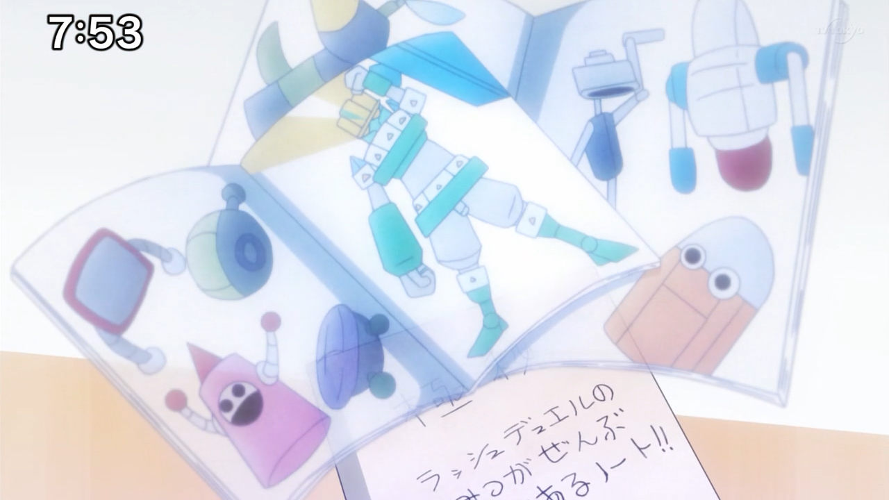 1) It was already obvious from the start that it had no real “secrets”, that’s why Yuuga was happy to share it with others. (Not to mention, if he really wanted to protect it, he probably would’ve have been carrying it around school, much less showcase it when he got his photo taken for the paper!) It didn’t surprise me the slightest to see his notebook full of designs for various robots and machines, as we have seen in his workshop. It also didn’t help how they took the notebook so seriously to the point they even considered it must’ve been written in special ink so they should take it to the lab. That is one example of something I didn’t find particularly funny.
