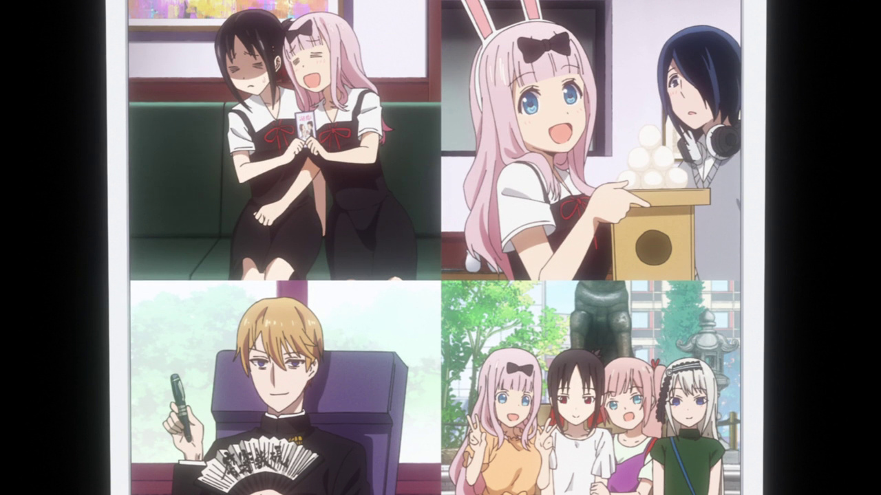 We also get another look into Kaguya’s upbringing of how her family doesn’t share their troubles with others. Which is probably why Kaguya just internalizes a lot of her problems and will always work around the subject rather than just outright stating her issue. Seeing how her family has treated her and have her do makes it seem like such a distant and cold upbringing, which is really sad. But I’m glad that she was able to create bonds within the student council which help bring her out into a more friendly light. Not only allowing her to feel a sense of belonging, but they also bring the best out of her and watch out for her. Despite the chaos that they tend to create, they all care about each other and want to help each other out when one is feeling down. I love how they all pitched in and shared all of the pictures they all took, restoring memories that Kaguya thought she had lost. It was such a sweet moment, especially when Kaguya broke down what is expected of her and actually told them what was bothering her. It was such a subtle character developing moment, but still just as sweet. Made all the more sweeter when the student council finally all took a group picture together, just for Kaguya.