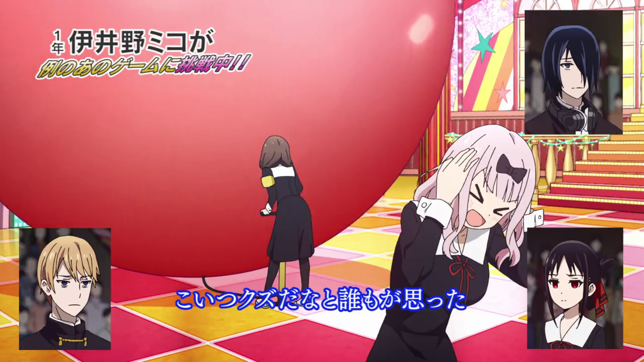 I’m gonna be honest with you. I felt pretty disappointed that the balloon popping game was going to be the season finale. I thought the season would end with Kaguya’s phone, leaving off on a touching note. But then it switched back to silly and I was a little annoyed at that. It was a cute little skit, don’t get me wrong, but it felt anticlimactic. Though I admit I laughed at how everyone would basically go back on their character development when faced with the terrifying presence of this giant balloon. Kaguya having to let go of the side of her face to blow up the balloon while internally freaking out over it was just hilarious. And then Ishigami essentially taking back all of his development from the last arc over this balloon ticked me so hard. He even made sure he moved his bangs so both his eyes were shown for the moment. Come now Ishigami, facing people and this balloon are two completely different situations lol.
