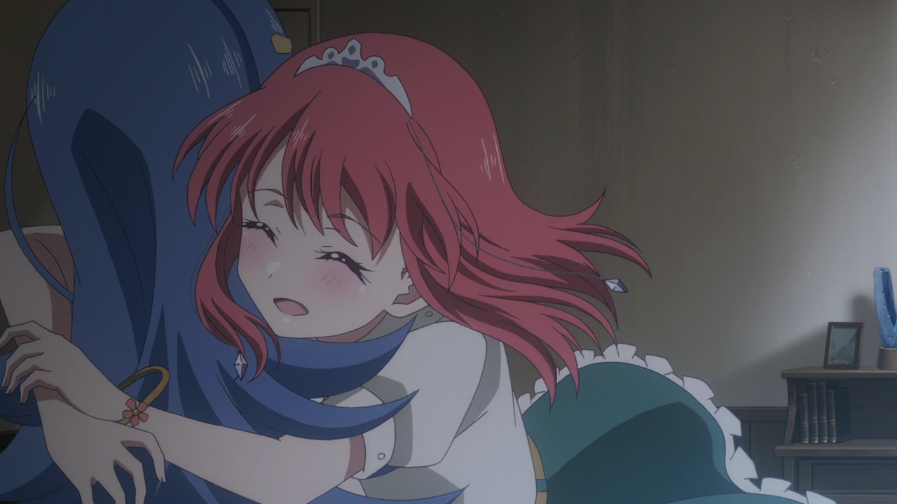 The magic in this world is pretty interesting as they have to whistle to activate their magic, as we saw many times where girls shot magic arrows, Tiara healing a flower, and girls flying on some badass looking flying saucers. We got some insight into their world, mainly with the figure Flora. They didn’t mention who she was exactly, but she seems to be incredibly important in this world as this witch/magic academy was named after this figure, and even saying a quick “prayer” before meals or in other occasions. She could be a goddess or simply an important historical figure, I have no idea. Either way, the world itself and the academy all look pretty interesting. And as we learn in the end, there’s a ranking/caste system in place at the school where the girls are separated into three different groups: Noir, Rouge, and Lapis. Lapis is the lowest rank in the school and they get the most discrimination there, and unfortunately that’s where Tiara finds herself in without even knowing.