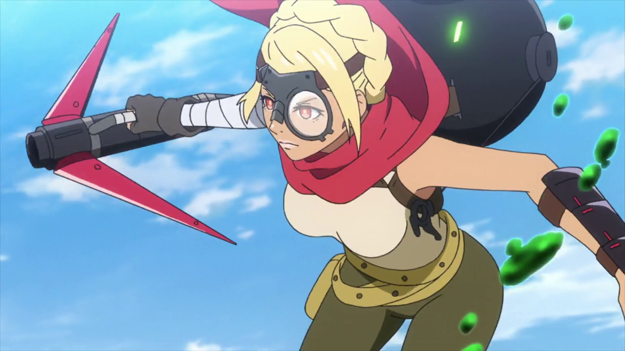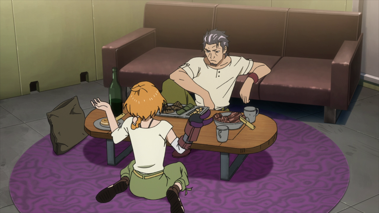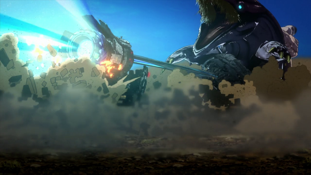 There was a lot of world building through out this first episode and I do appreciate that they took the time to try and show us what goes on in this post-apocalyptic world. I feel like people tend not to like slow first episodes, but I rather enjoyed this one. It kind of gives us time to get a feel for the world along with how the characters interact with the environment. I already really like Natsume as a character. She’s just so full of energy and life despite this world being super dreary and desolate. Especially since I can only guess she’s now an orphan after her dad died in the first few minutes of the episode. As soon as that man said he would make it back home, I knew this guy wasn’t going to make it. Natsume is a tanker who wants to be a Gear but is reduced to armor repair er cleaner to be more exact in what she actually ends up doing. At first I thought she had given up on her dream to be a Gear, but with how things played out in the episode, I’m sure she’s going to be heading in the direction of her initial dream and show everyone that she can do it. Which is pretty cliche when I write it out like that, but we’ll see if this series can make it convincing and make me want to root for her in that way.