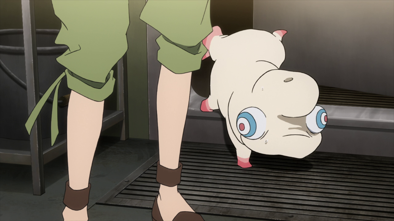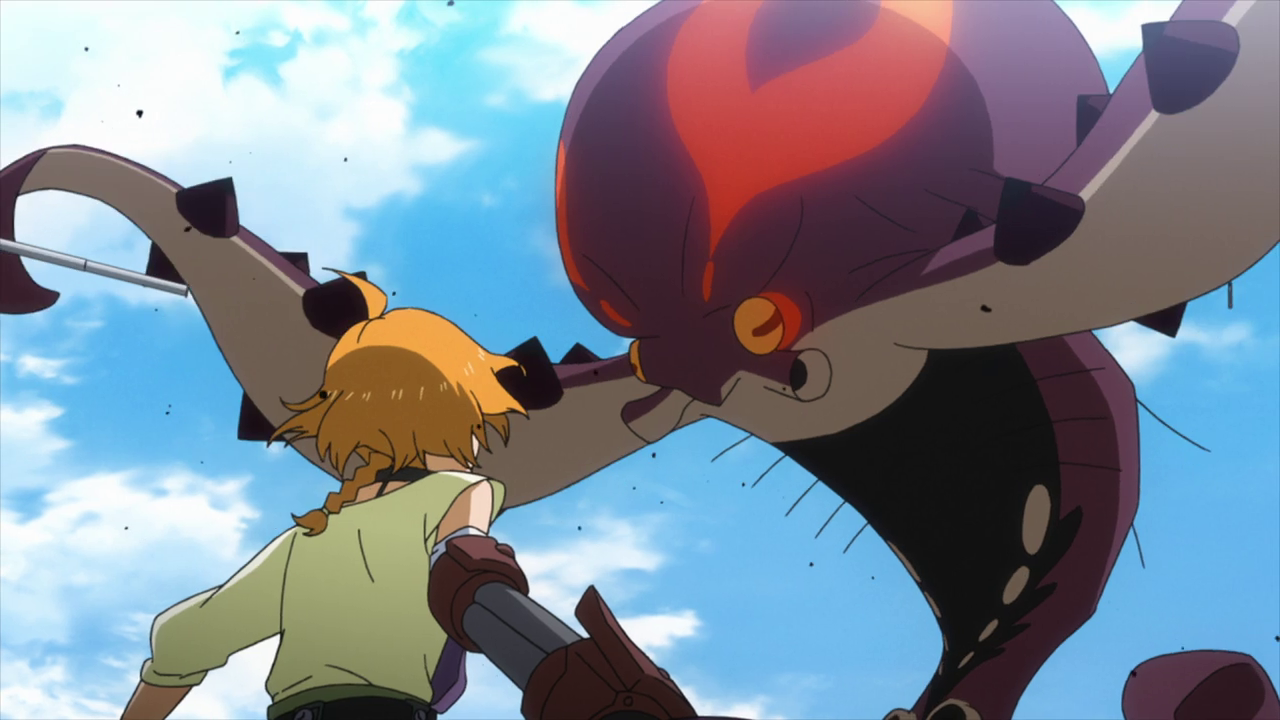 I’m not sure how I feel about Kaburagi yet since he seems like that typical, “doesn’t talk much and is strict” kind of adult-figure. Though it seems like he’s got some sort of complicated history because not only does he seem to be working for some shady organization, he’s keeping a small monster thing called a “gadoll” as a pet secret and he is suspiciously great at using the gear soldier technology. He by far is one of the bigger mysteries in this series that I wouldn’t mind finding out more about. It almost seems like this will be his story that we’ll be following rather than Natsume’s. Though I do hope that he and Natsume form some sort of father-daughter relationship since they do seem to already bounce off each other pretty well in that regard.