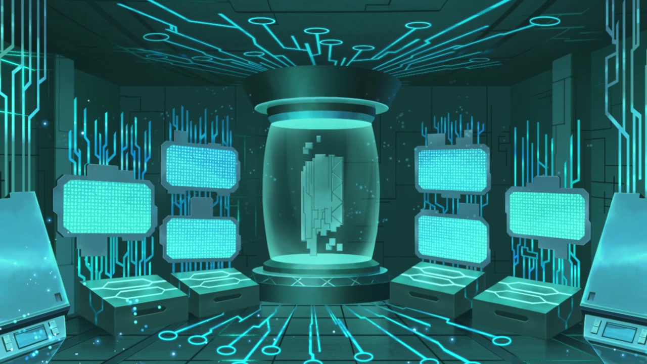 Anyways, once the group makes it inside the empty fortress there is a happy reunion. The DigiDestined move on to find a mysterious room with what looks like a giant floating computer chip of some kind, as well as several large monitors. When Taichi approaches the large chip his Digivice starts to glow. He reaches out to touch the chip and although he cannot read the script, Taichi somehow knows that it has something to do with the Holy Digimon. Transference by osmosis I guess? Seems a little lazy, but ok.  >>