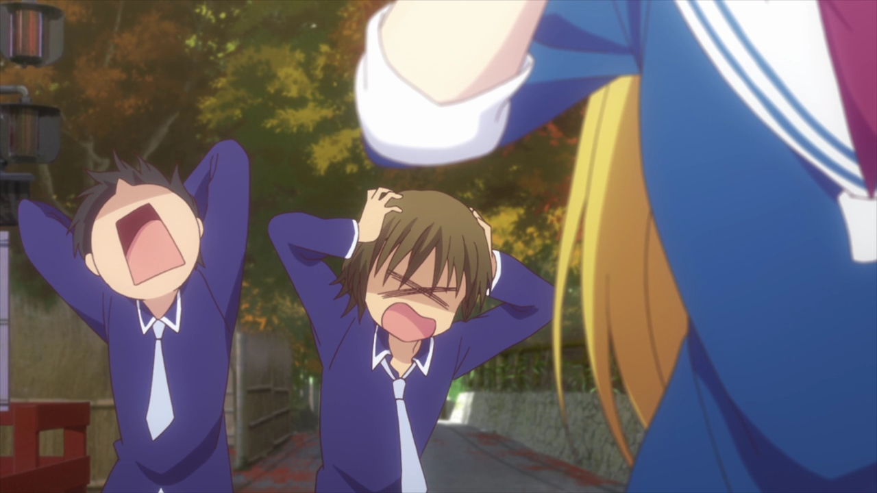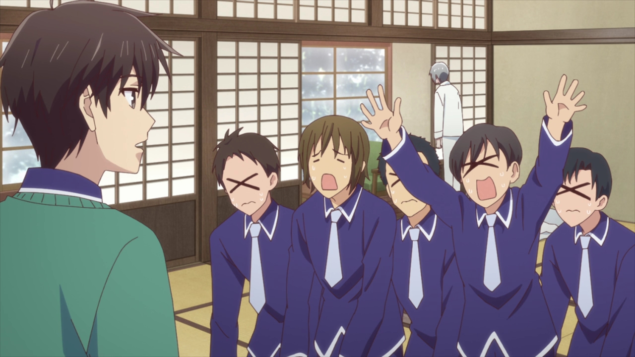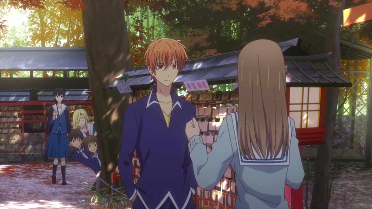 Tohru hasn’t told Uo about Kureno, but her attention quickly shifts when the group finds out that Kyo was being confessed to. Kyo was a lot more irritable this episode, and I can sort of see why. His response to the girl, that he doesn’t even know so these random confessions are always stupid, was a little much but it could be interpreted in two ways: 1. I’m too good for you, why would you ever fall for me?, but most likely 2. You don’t understand how dark and crappy of a person I am, why would you want anything to do with me. Kyo has never really seen himself in high regard and he doesn’t want to get too close with most people. He says he can’t like everybody and that’s true, but he’s always isolated himself from people. Knowing that he’s going to be locked up, it’s no wonder he feels this way. There’s no point being popular and making too many friends and liking people when he’s going to be trapped, and knowing his true form most people wouldn’t accept it. Although his response to Tohru after all that happened was a little harsh though, so I appreciate Yuki giving him a bit of a smack.