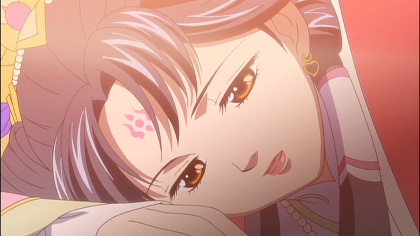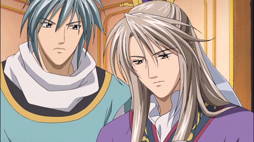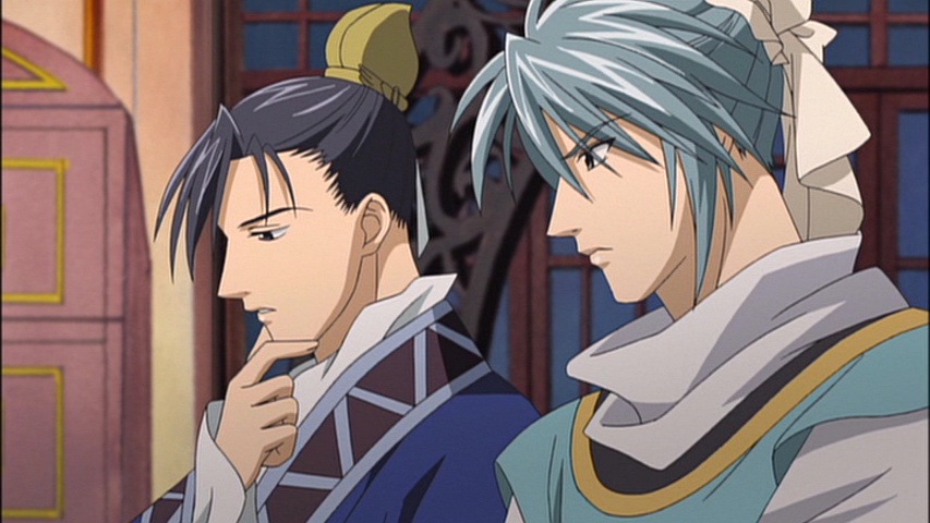 Seiran asks Enjun why he would go so far as to kidnap Shuurei and risk harming her, and Enjun tells him it was a “gamble.” Originally Enjun Sa had wanted the Sa Family to be at the top of the Seven Families. If you remember that each province in Saiunkoku is lead by one of the Seven Families, what I think I neglected to mention in my first post is that each province is also assigned their own color, thus being known as the “Eight Colored Clans of Saiunkoku.” The Sa Clan originates from Sa Province, and their royal color is brown. The Sa Clan is also the least respected of all the clans in Saiunkoku, something Enjun is painfully aware of and has tried his best to overcome. Enjun is particularly sensitive about his rivalry with “that man” whom Enjun reveals to be Advisor Sho, one of three Grand Official like Enjun himself.