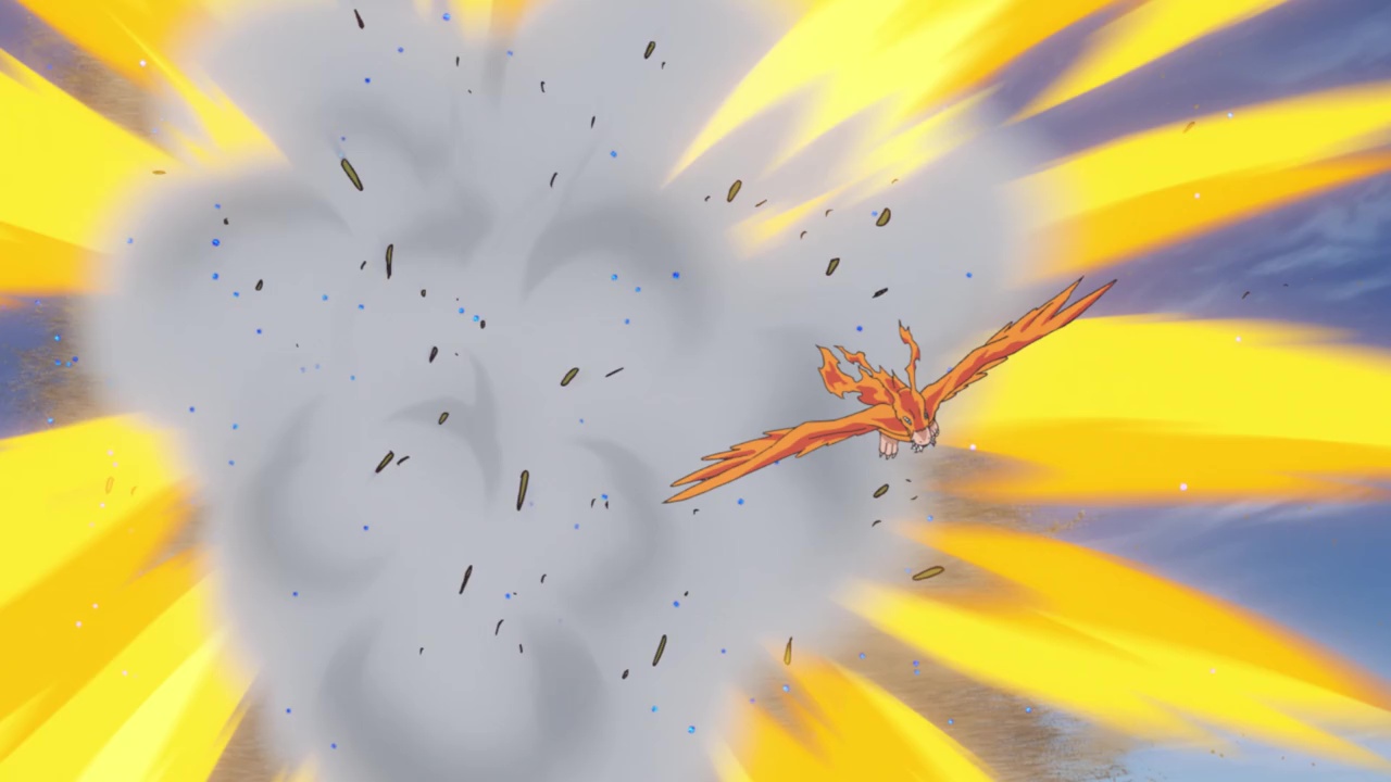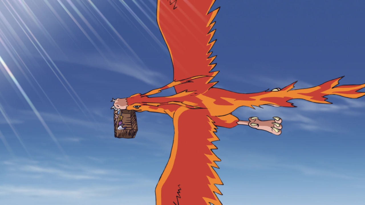 Meanwhile Yamato’s team, Team 2, has encountered a desert south of the swamp. They’re in the process of flying over it in a basket carried by Birdramon when they are attacked by flying Sandyammamon, which can conjure up dust devils with their screeches. When Joe’s team is forced to land they are attacked by Scorpiomon hiding in the sand. Yamato’s group also encounters some Kyaromon bystanders who are also caught up in their fight against Scorpiomon. Yamato, being stubborn and the strongest member of Team 2, insists Sora and Joe go on ahead with their Digimon while he and Garurumon fight against Scorpiomon.