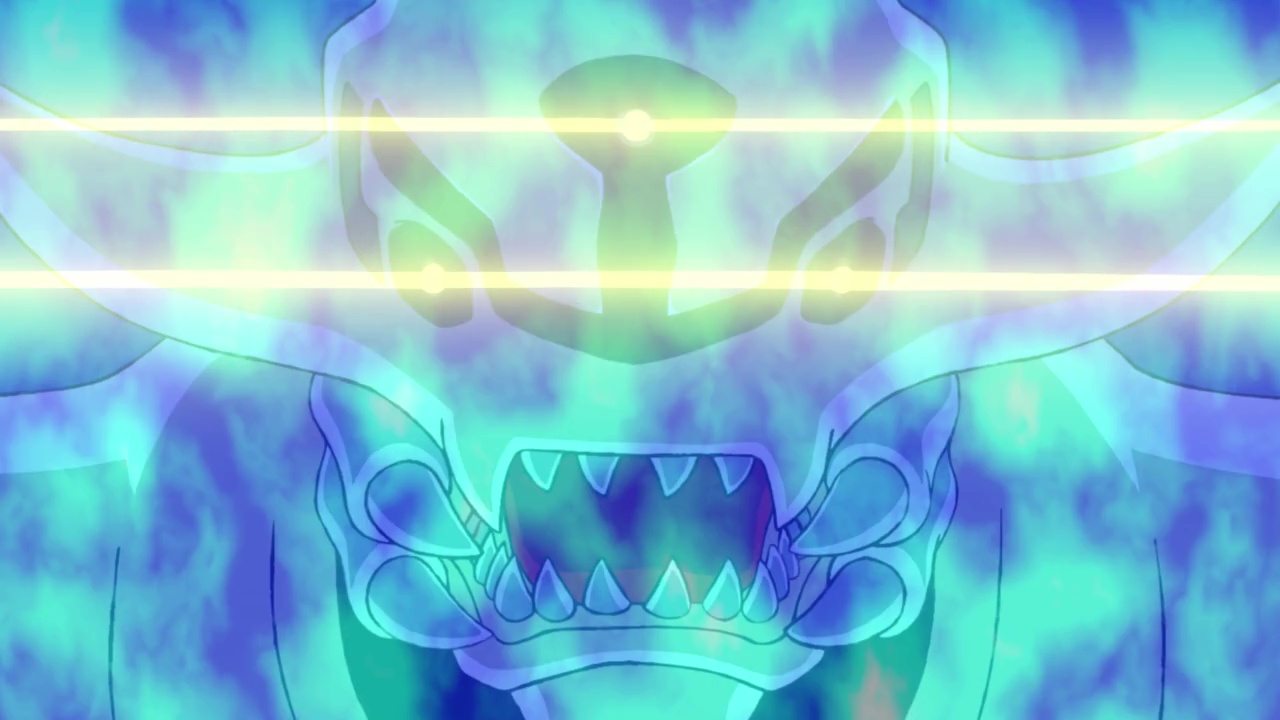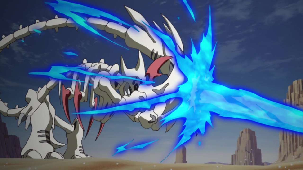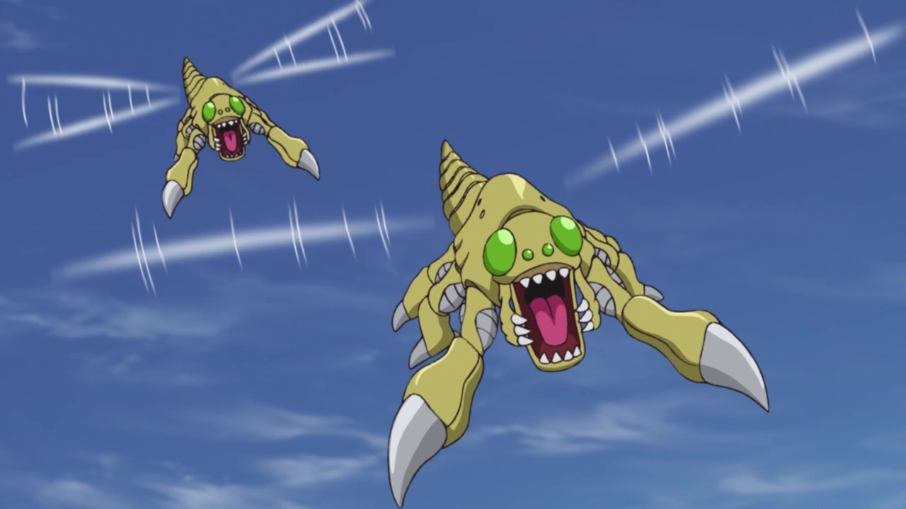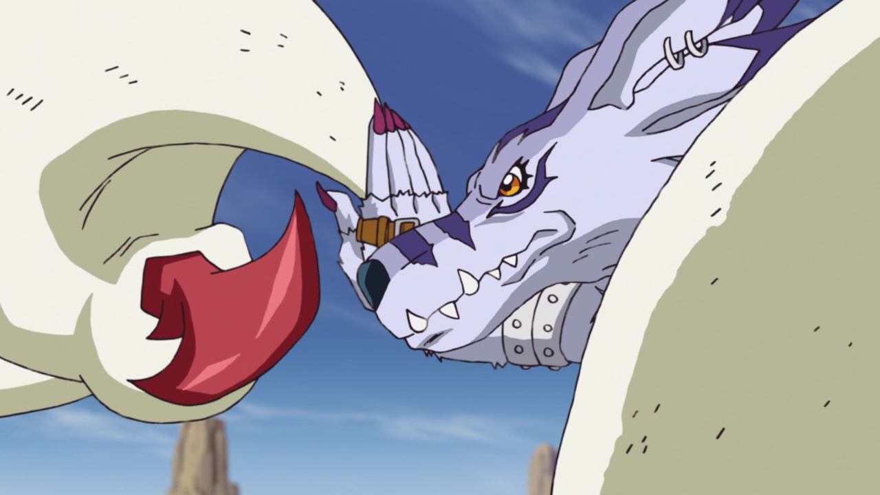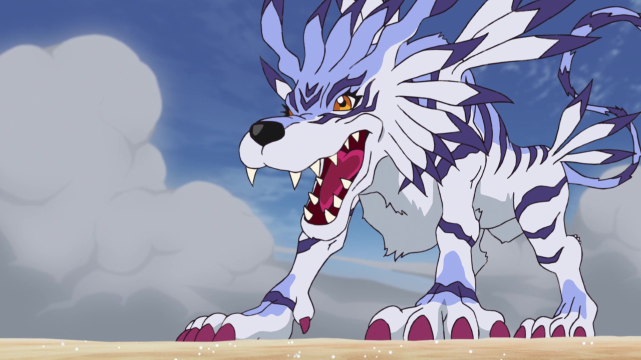 Scorpiomon is shown to have black smog coming from its mouth like Metaltyranomon did in the previous two episodes, revealing that it is one of the infected Digimon Neamon mentioned earlier. As Metalgreymon became stronger than Metaltyranomon, Weregarurumon is now stronger than Scorpiomon. With Sora and Joe watching in awe, Weregarurumon quickly disposes of Scorpiomon like it was nothing.