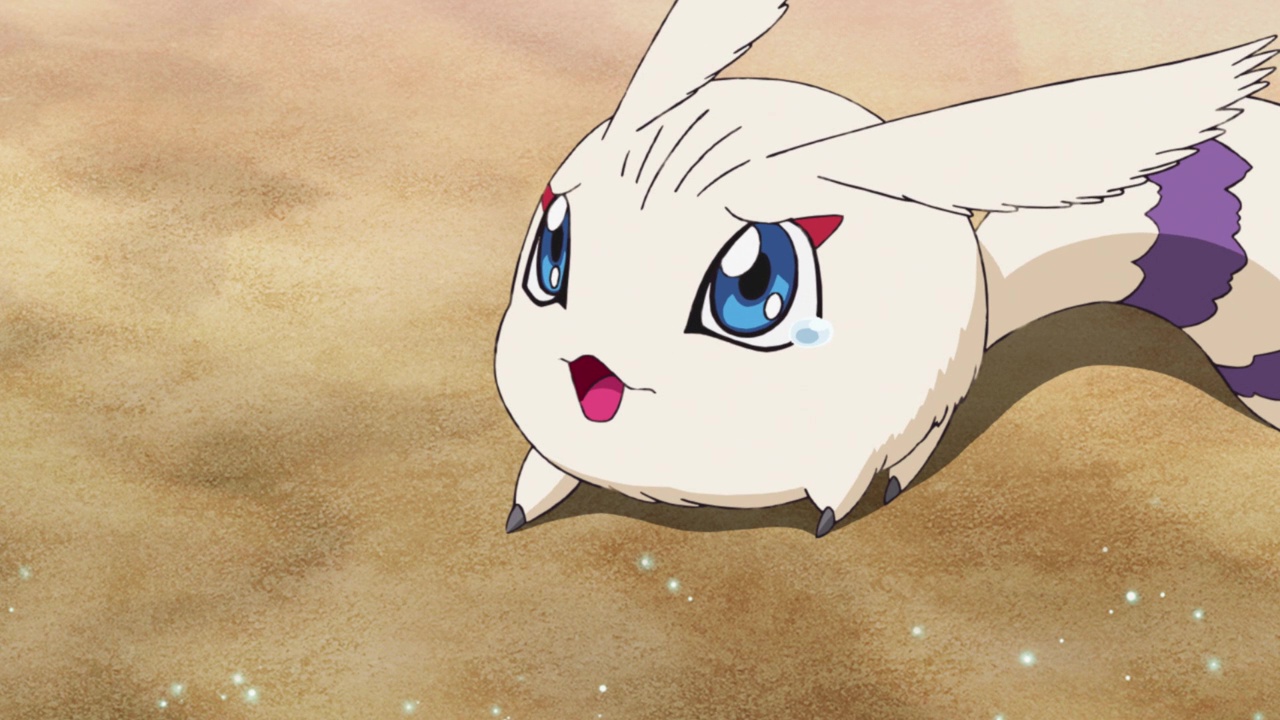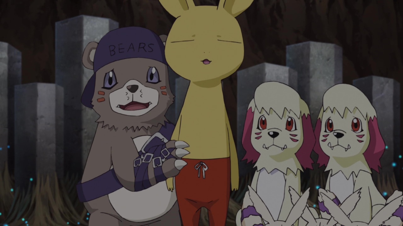 Yamato manages to overcome (but not defeat) Scorpiomon and together with Gabumon, the two press on until they catch up with Sora and Joe. The Kyaromon lead the Digidestined back to a cave where the rest of their group (a Bearmon and two Labramon) and their leader Neamon are hiding. After thanking the DigiDestined for saving Kyaromon, Neamon explains that a Digimon named Leomon is leading a resistance against some strong Digimon who are “infected with miasma” like Metaltyranomon was. Neamon and his group want to find Leomon but are too scared to cross the desert alone; staying put will also likely eventually end up with them dead when a stronger Digimon find and turns them into prey. Sora and Joe want to help but Yamato does not, so he presses on alone.