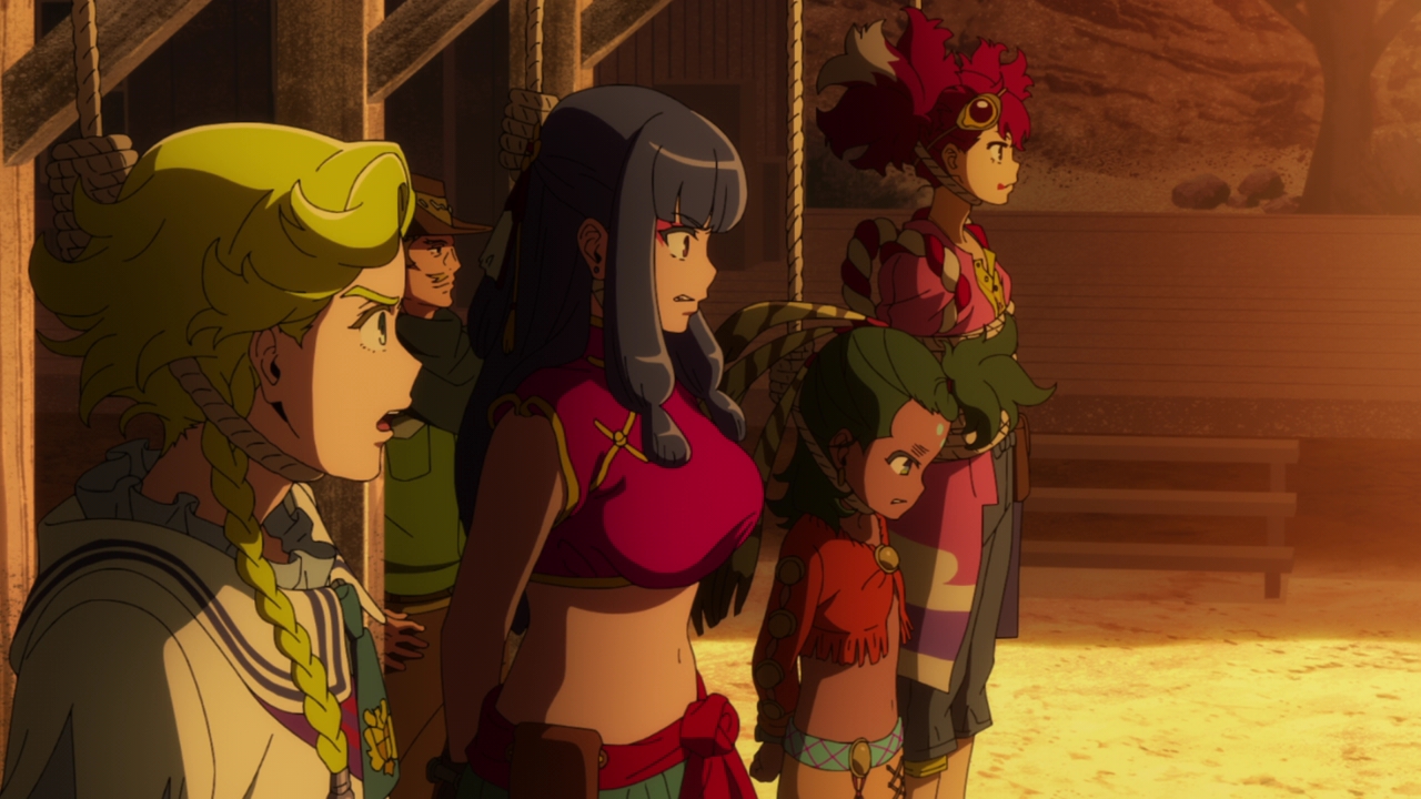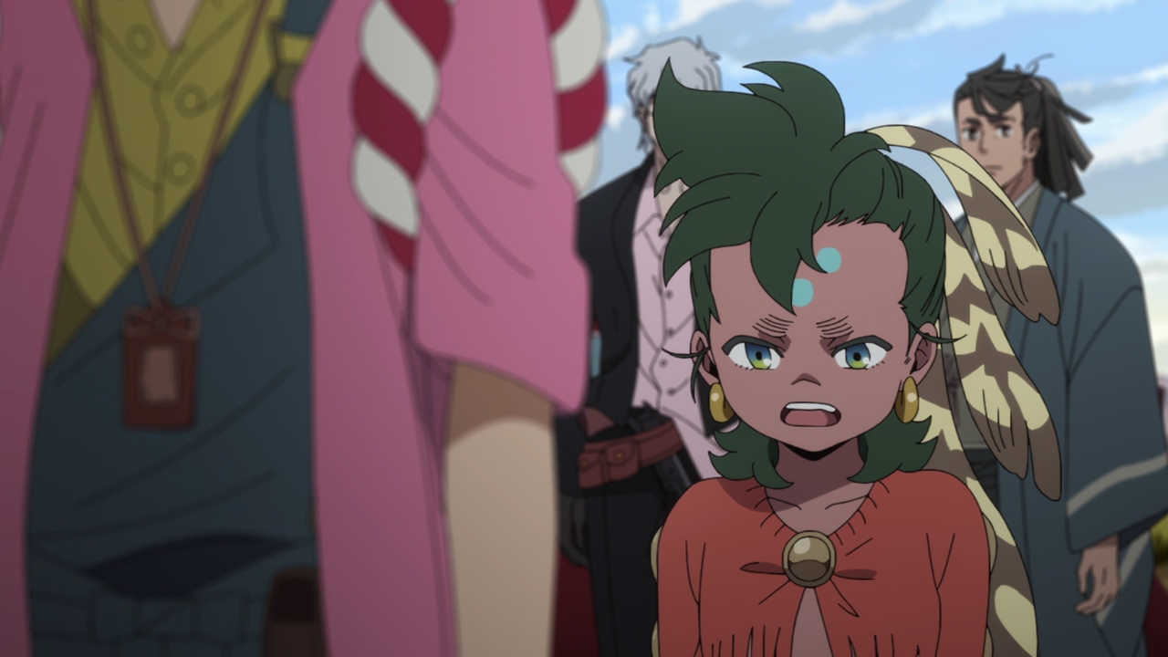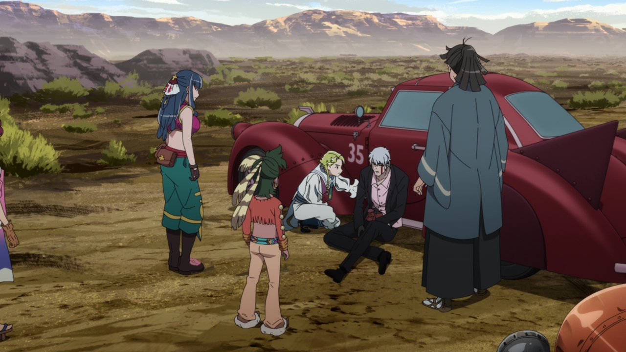 Our main group get back into the race only to be stunned at what they find. The other (non-important) racers killed, except for Gil. He explains that five men on horseback with snake tattoos attacked them and left with a parting message. People will die in this race. It’s ominous and very scary to hear, but once Hototo learned that these men had snake tattoos, he was adamant about going after them and surprisingly Appare agrees on it. Though his reason was more for the loss of valuable racers though I’m sure he cared about Hototo’s personal matters as well. The group head to the port town and they have a run in with the five men, and Hototo finds the man with the neck tattoo. All were captured, except for Kosame and he was left with shame and anger at his cowardice.