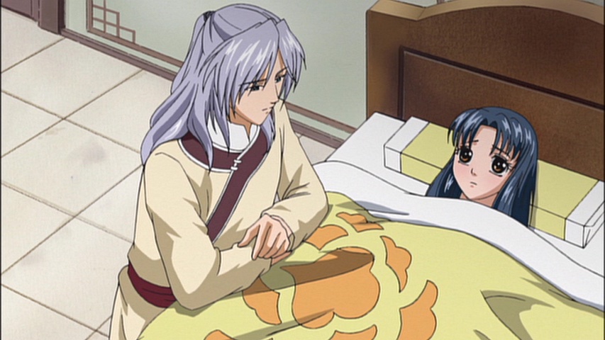 Seiran, Shuuei and Kouyuu finally find Ryuushin unconscious in a cave, clutching an herb in his small hand. They bring him to Minister Kou’s house, as was previously agreed upon. He is slightly frostbitten but will recover. Minister Kou soon brings Ryuushin over to see Shuurei because he was so upset over Shuurei being sick. Ryuushin is also worried that Shuurei will soon get married and he asks her to wait for him so he can marry her. ^^;;   Ryuuki tries to butt into the conversation but stops when a handfan is “mysteriously” thrown at his head from out of nowhere. (Reishin strikes again! Haha, the recurring mysteriously appearing fan is one of my favourite running jokes in Saiunkoku.)  Minister Kou leaves to take Ryuushin back to his home, and he drags Reishin with him.