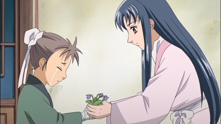 Left alone with her thoughts, Shuurei seems troubled that Ryuuki continues to try to become closer to her. She thinks that he needs a kind and beautiful woman as his consort, never realizing that she herself has those traits and they are some of the reasons why Ryuuki loves her. Elsewhere in the home Shouka remembers his wife and how Shokun went from resisting Shouka’s advancing to loving him and bearing his child. Even though Shokun has been gone for many years, Shouka still loves and misses her. I have no shame in admitting that I cry every time I watch this scene.