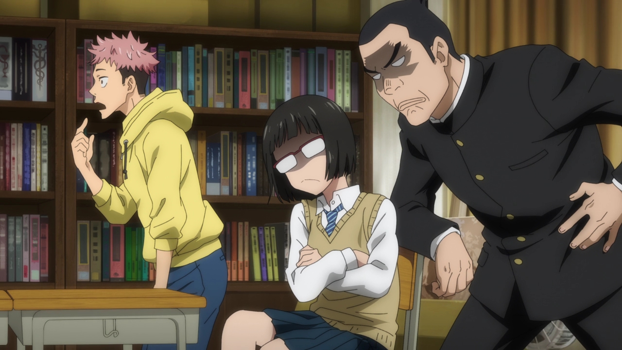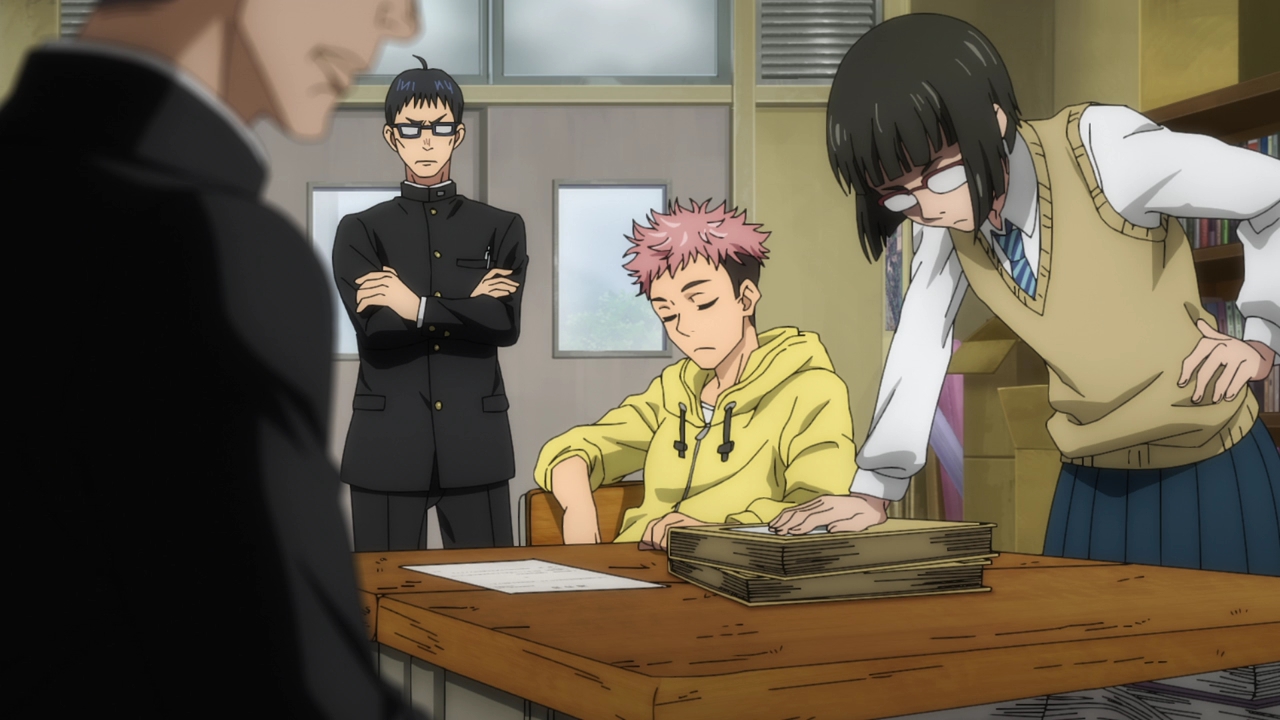 We meet Yuuji Itadori, our main character who cares for his dying grandfather and takes life on pretty easily. He’s silly but not too silly, more of a laidback type but still can be funny. He hangs out with the Occult Club as he enjoys his time there more, but with his insane athletic ability he used to be part of track and he has a reputation around school for being so ridiculously strong. I’m wondering if there’s a reason why Itadori is so strong, and his grandpa kept mentioning going to his club (I’m guessing he still thought he was in track) and that he had a strong body. It’s probably nothing because, well, this is a shounen. He’s probably strong just because and we gotta accept it. Still, I’ll keep it at the back of my mind if there’s something more to it, and if his parents have anything to do with it. They were very briefly mentioned by the grandfather so there must be some importance. Also wow the grandfather died so quickly it shocked me! I feel like we’ll see him in some flashbacks but the death was so quick I didn’t even believe it at first until I saw the paperwork. I was worried the show was rushing through things but maybe that’s just how it was in the manga?