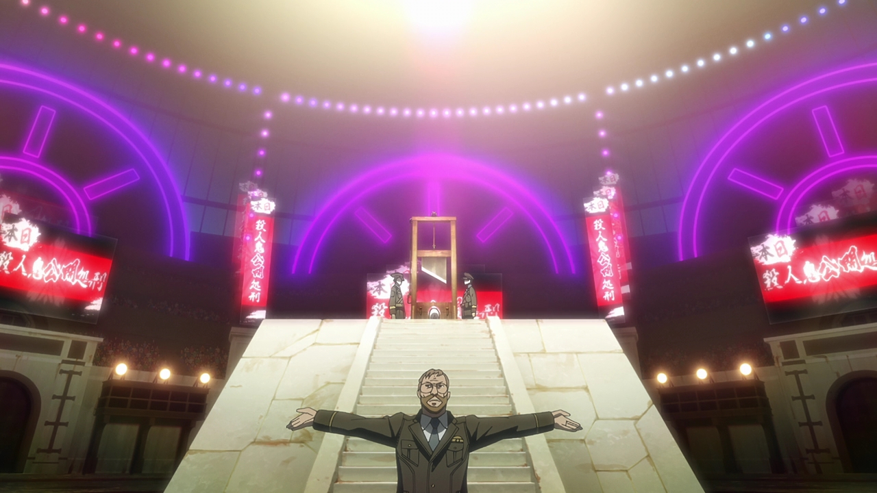 I’m not going to compare Akudama Drive to Danganronpa too much because it’ll get annoying, but it is interesting that this one is much more violent. Danganronpa’s violence was always a little more silly and never too gory, what with the pink blood and all. It was a death game but it was never too graphic and the executions were more of the strange and (in a messed up way) comical fashion. But here it’s much more violent and gruesome with (red) blood and severed heads. The censors for it is so strange though and pretty ugly and distracting, it’s not the worse censorship I’ve seen but it’s still disappointing. I’m guessing this airs at an earlier time for some reason which would explain why they had to do this. It’ll have to be something I’ll have to get used to.