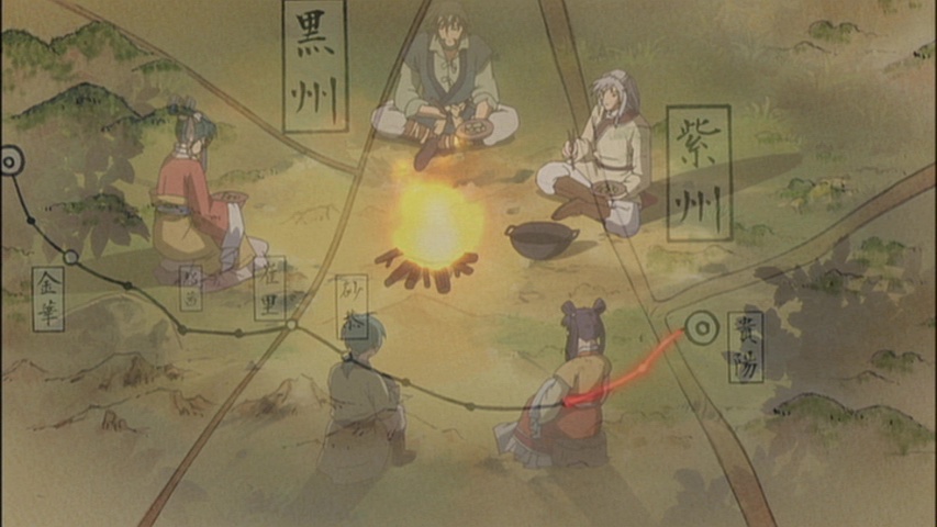 The scene between Ryuuki, Ensei, Kouyuu, Shuuei and Advisor Sho quickly brings the viewer up to speed on what’s going on in Sa Province. There’s tons of turmoil and unstability, even with Yuushin Tei holding down the fort alone as best he can. Advisor Sa’s wife, Lady Eiki, is under guard in the Sa family home and not able to move around freely. Meanwhile Advisor Sa’s granddaughter, Shunki, managed to escape and is hiding in an undisclosed location. So the faster Shuurei and Eigetsu can safely get to Sa Province, the better.
