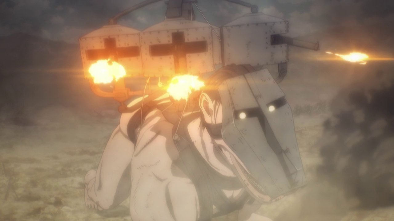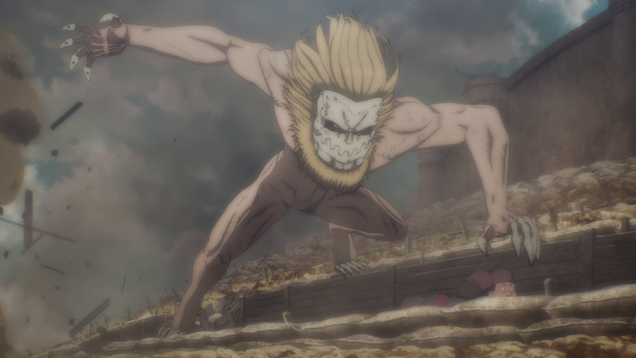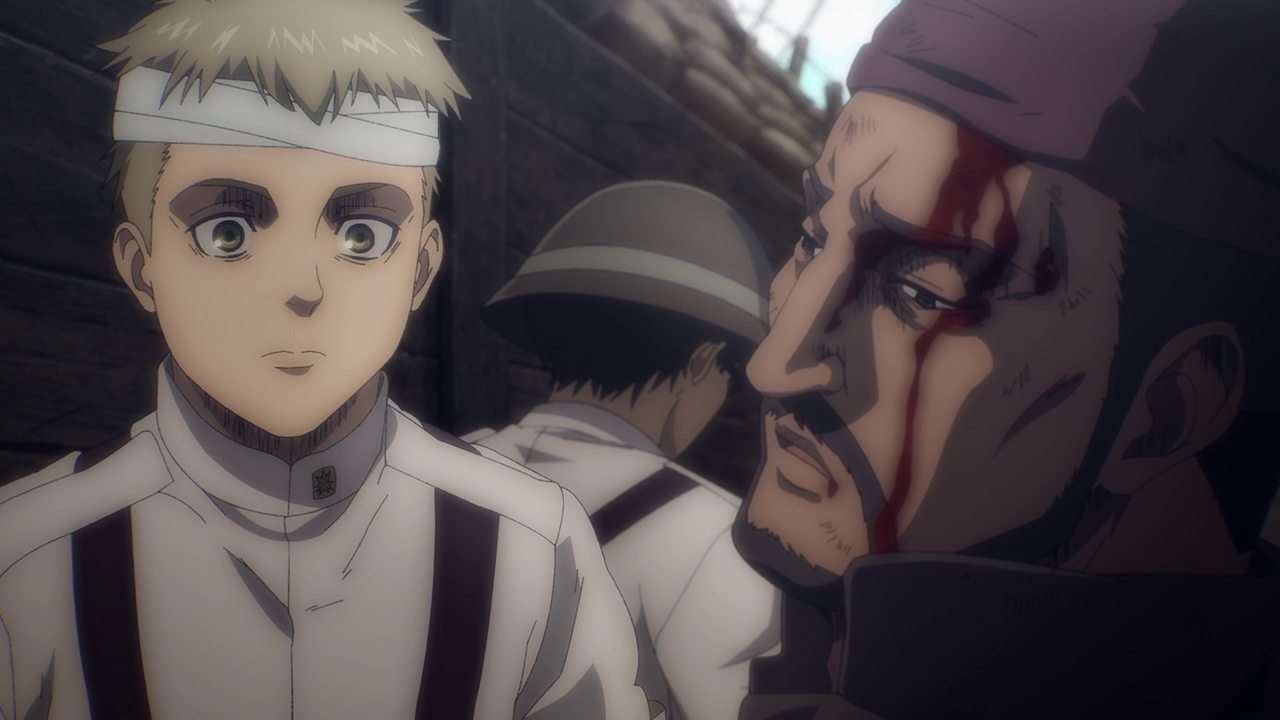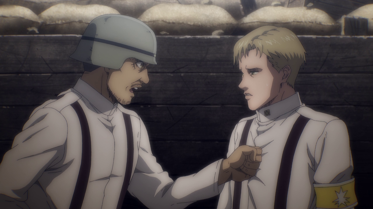 Aside from the new characters, there was A LOT going on in this first episode. Because of the loss of the Colossal and Female titans, another country sought to attack and take over Marley while it was weakened. We get to experience just straight up trench war with the Eldians essentially used as fodder and how they utilize the Titan shifters in battle. Not gonna lie, even though the quadraped titan freaks me out, the way they made it into a war machine of sorts was genius. But man, you gotta feel for the Eldians as the Marleyans have no qualms with just sending them out to die as suicide bombers and such. And you can just tell just how terrified they all are because they KNOW they’re going to die. They even went as far as to drop sacks of people and turned them into titans to use against the enemy Despite their efforts, it’s just sickening to see the people praise the “Marleyan” army for their courage and strength when it literally was all the Eldians’ doing. But that’s propaganda for you.