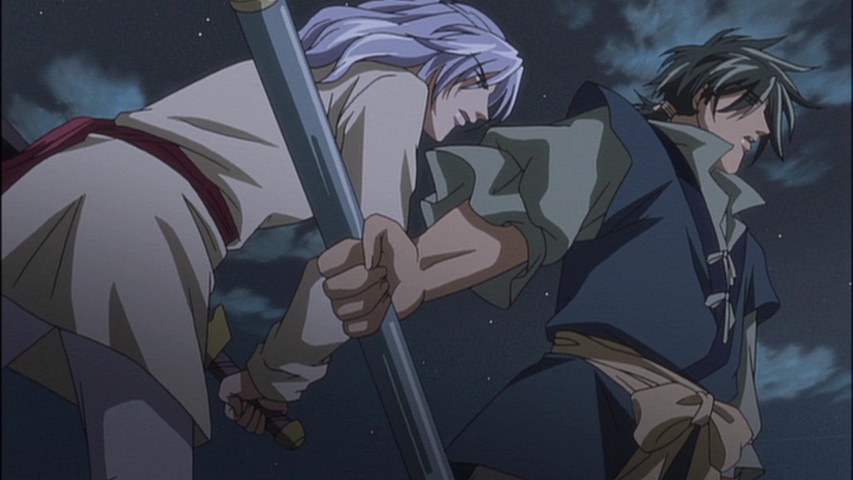 Elsewhere Meisho and Ensei are having a verbal spar. Seiran is just overwhelmed with anger and Ensei is forcing Seiran to stay behind him, lest he lose control. I think it’s really neat in this scene how we see Ensei looking something other than happy or serious – he’s pissed. His eyes and body language have changed drastically upon Meisho’s arrival. Seiran’s more obvious with his anger; Ensei’s lurks just beneath the surface like a circling shark, tracking its prey as it edges closer.
