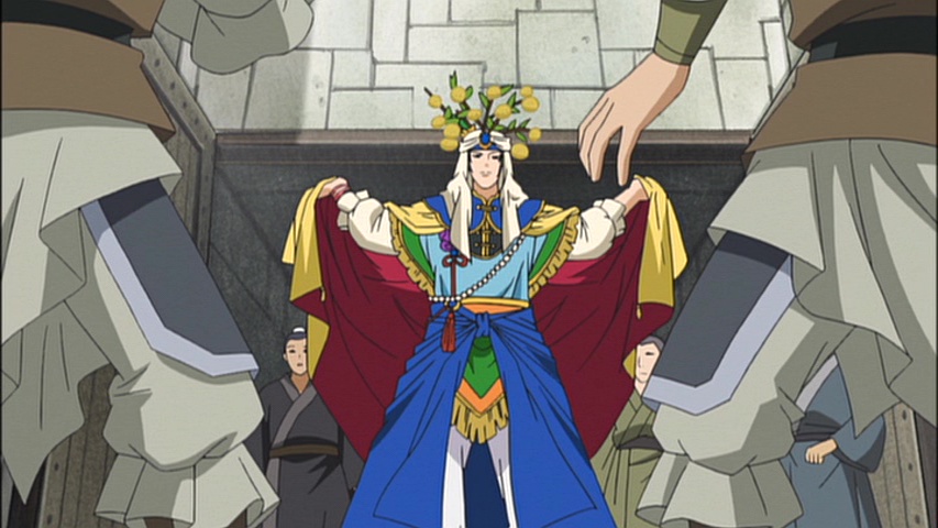 Enter Ryuuren! He’s trying to get into Kinka but can’t find his pass. When he does finally reveal it by hopping around like a rabbit, the pass falls to the ground and reveals to the guards who he actually is. And if they hadn’t guessed from his pass, Ryuuren’s awful flute playing is a dead giveaway! ;D