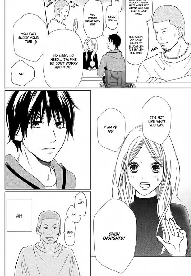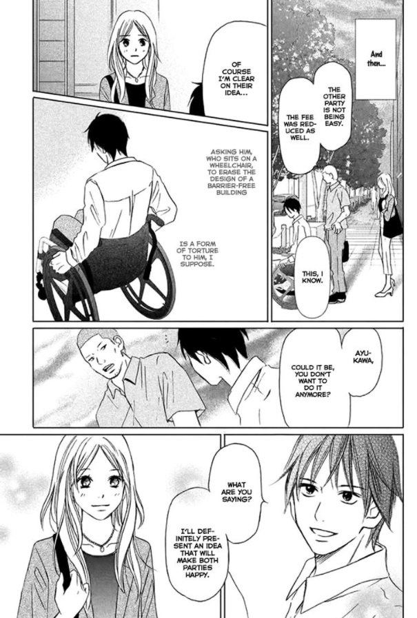 Much of the first few chapters revolve around Itsuki’s insecurities about being disabled and Tsugumi’s doubts about whether she’ll be able to be a supportive enough partner for him given that she’s never dated someone with a disability before, nor does she know anything about paraplegia. Notably, after his accident Itsuki retreated inside himself and rejected the idea of ever again being in a relationship, especially after he pushed away his high school girlfriend post-accident. He knew that life would be difficult for his potential future partner and resolved to live alone instead. Therefore he must push through these doubts and learn to trust Tsugumi. Meanwhile, Tsugumi’s insecurities tend to manifest as her freaking out over Itsuki being sick and/or hurting himself because she doesn’t yet fully know what she needs to know about about dating someone with a disability, so she overreacts and panics.