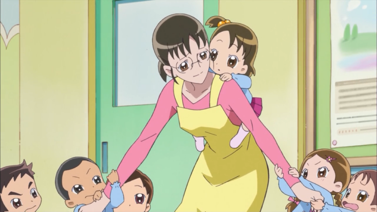 I really don’t have much or anything to to say about this one besides the fact it was cute. However I must confess, I found it a bit painful at first to watch Noriko struggle with managing the children. It was a completely mess because she was letting them dictate the pace. So when the girls came in to do a puppet show, Yuri’s ability to quickly get the children under control made her feel ashamed of herself. So Kumojacky finds her, turns her into a monster and the children freak out. When she doesn’t come to their cries, Hiro, one of the children who really adore her was the first to courageously run out and start taking a fit at the monster. Before long the rest of the children followed and it was both funny and really sweet to watch them go after the Dessertian trying to get their beloved teacher back. So when she finally came to, it was very heartwarming to see the children expressing concern for her, even asking if she needed a longer nap.
