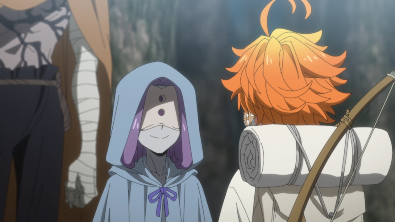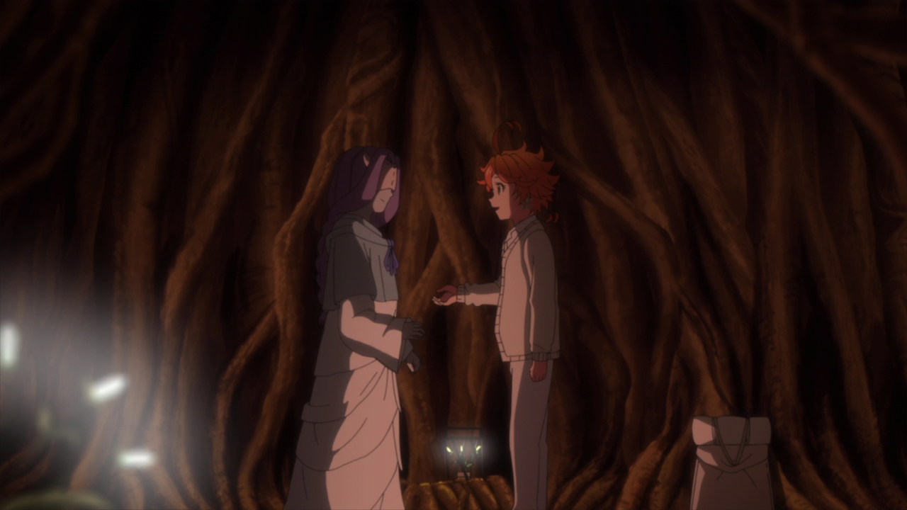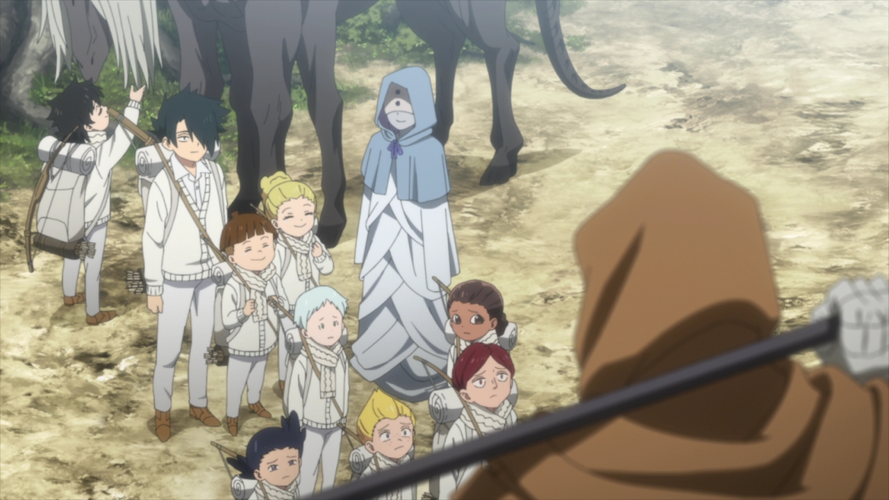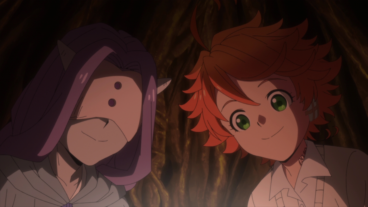 It seems that Sonju is going to continue to be helpful for the children, as we saw him take down their pursuers in the forest. On one hand it’s like, thanks I guess. But knowing his true intentions, it feels scummy and I don’t even know how to feel. He won’t touch them because their doctrine says that there’s no problem eating natural humans, not farmed ones. Emma and the others are farmed creations so they’re off limits. He’s eagerly awaiting the next generation of their offspring so he can hunt them down, and we can see he’s desperate enough for human flesh. That shot of his teeth was terrifying. Mujika doesn’t seem that way at all and doesn’t show any interest. She seemed to really share a bond with the others, with Emma. I couldn’t help but go AHHH and point at the screen when Emma said that Mujika didn’t really seem like a demon, just going back to my theory that maybe Mujika (at least) was once human. She did say that this was the first time she’s ever met and spoken with humans, but I don’t know. Still interesting to think about.