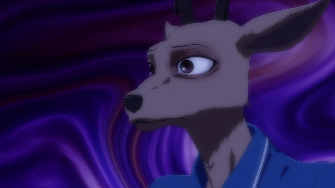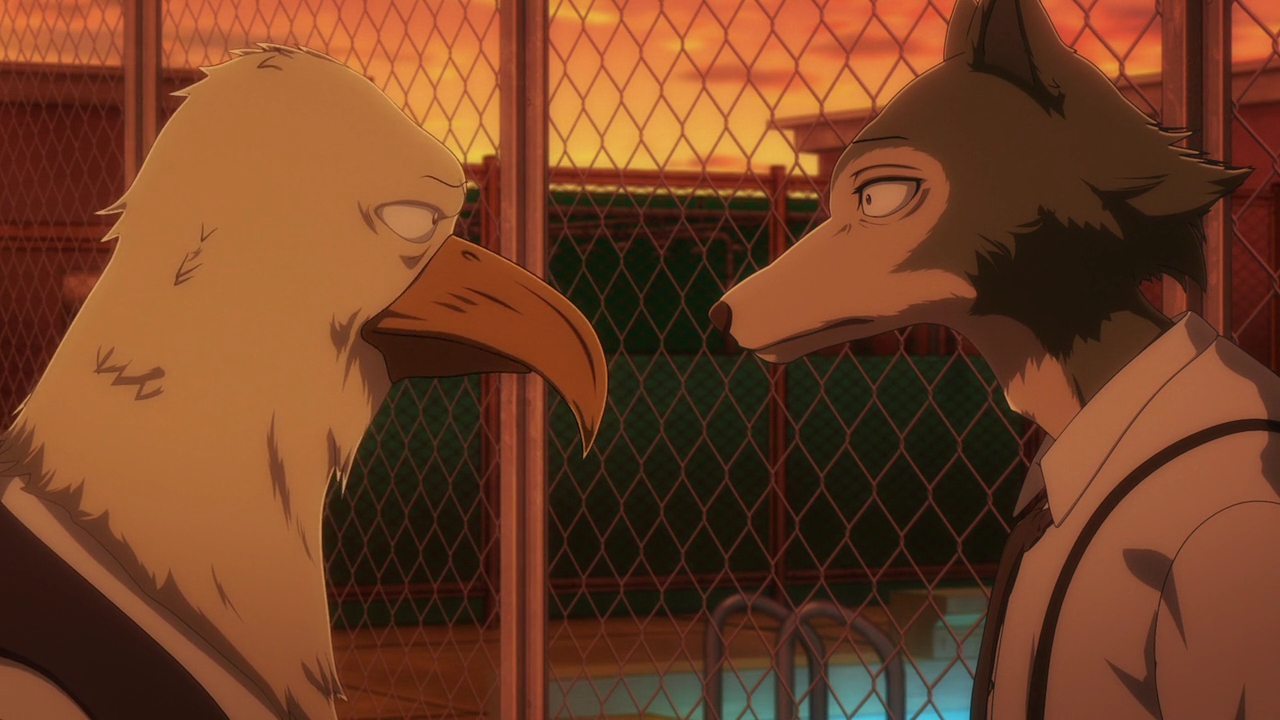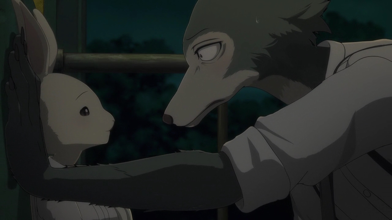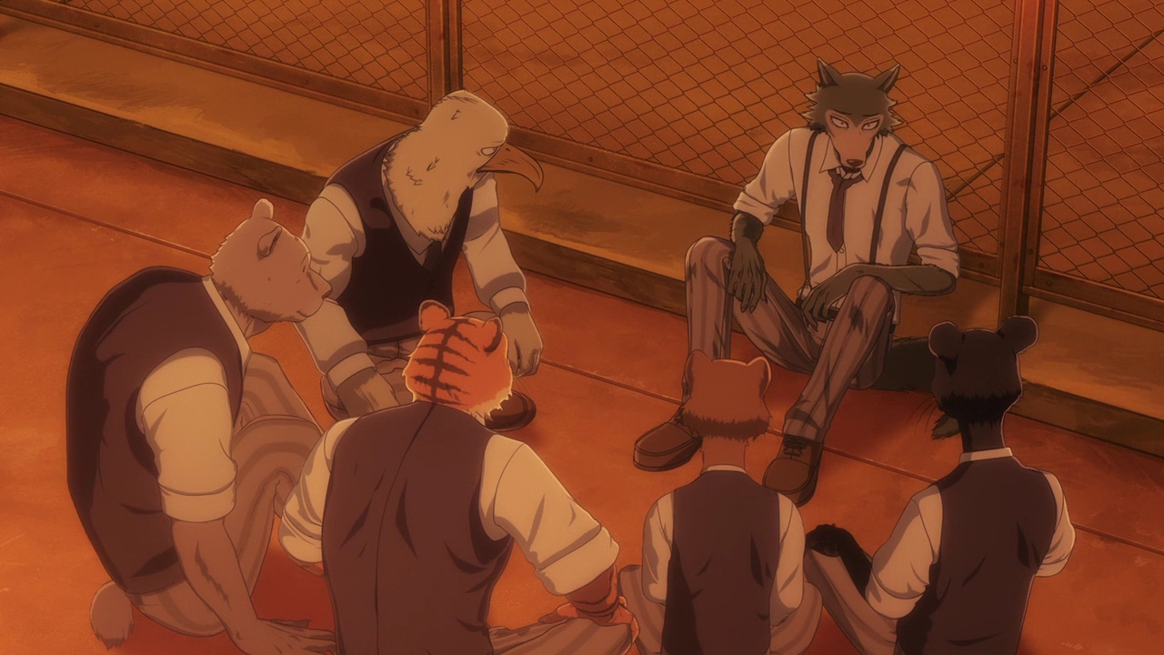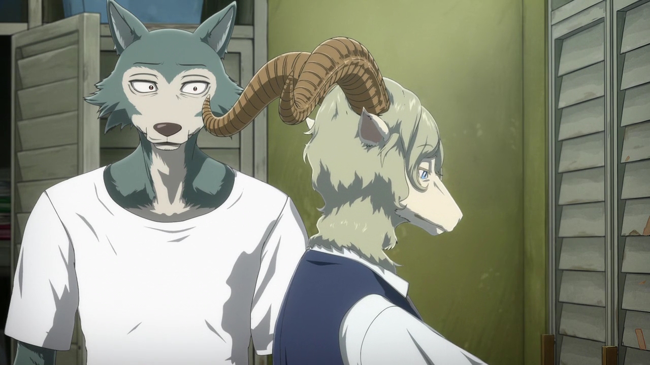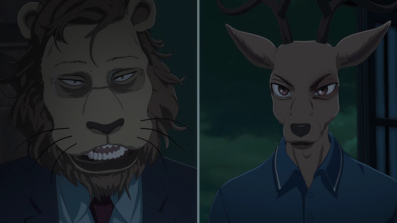 Thinking of what Hexeye told him, Legoshi decides to confront the carnivores of drama club (the boys at least) about Tem’s death, which sparks a mini fight with Bill to no surprise. It doesn’t really lead to anything because both times Legoshi tries, he gets sidetracked with something else. First, Pina intruding and talking shit to their faces, and the second time with the boys being horny boys and wanting to know what happened between Legoshi and Haru. And interestingly, this leads to a step back in terms of their relationship.