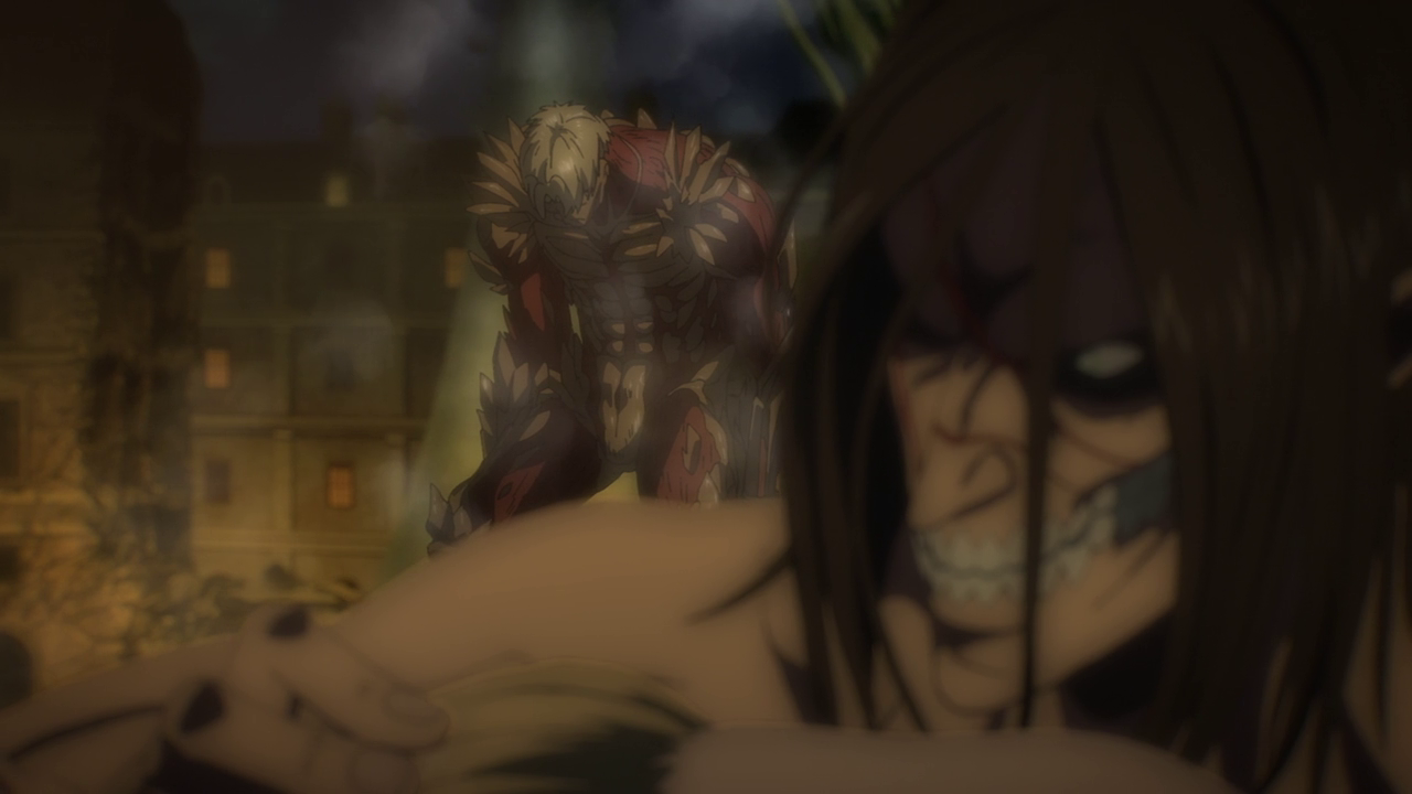 But man, every episode just continues to make me feel more and more bad for Reiner. The poor guy just wants to be put out of his misery, but still goes above and beyond to help those he cares about. Not only did he transform to save Falco when Eren first transformed, but he pushed himself to become a half covered Armored Titan because of Gabi and Falco screaming for his help. It was probably the best he could do with his depressed mental state. But I also think it’s important since he’s still going despite the depression, continuing to fight even when he thought he had given up. Now that I think about it, what Gabi and Falco did for Reiner felt very reminiscent of what Armin did for Eren when he went out of control all the way back in season 1. They had to have others cry out for their help to bring them out of their slumber.