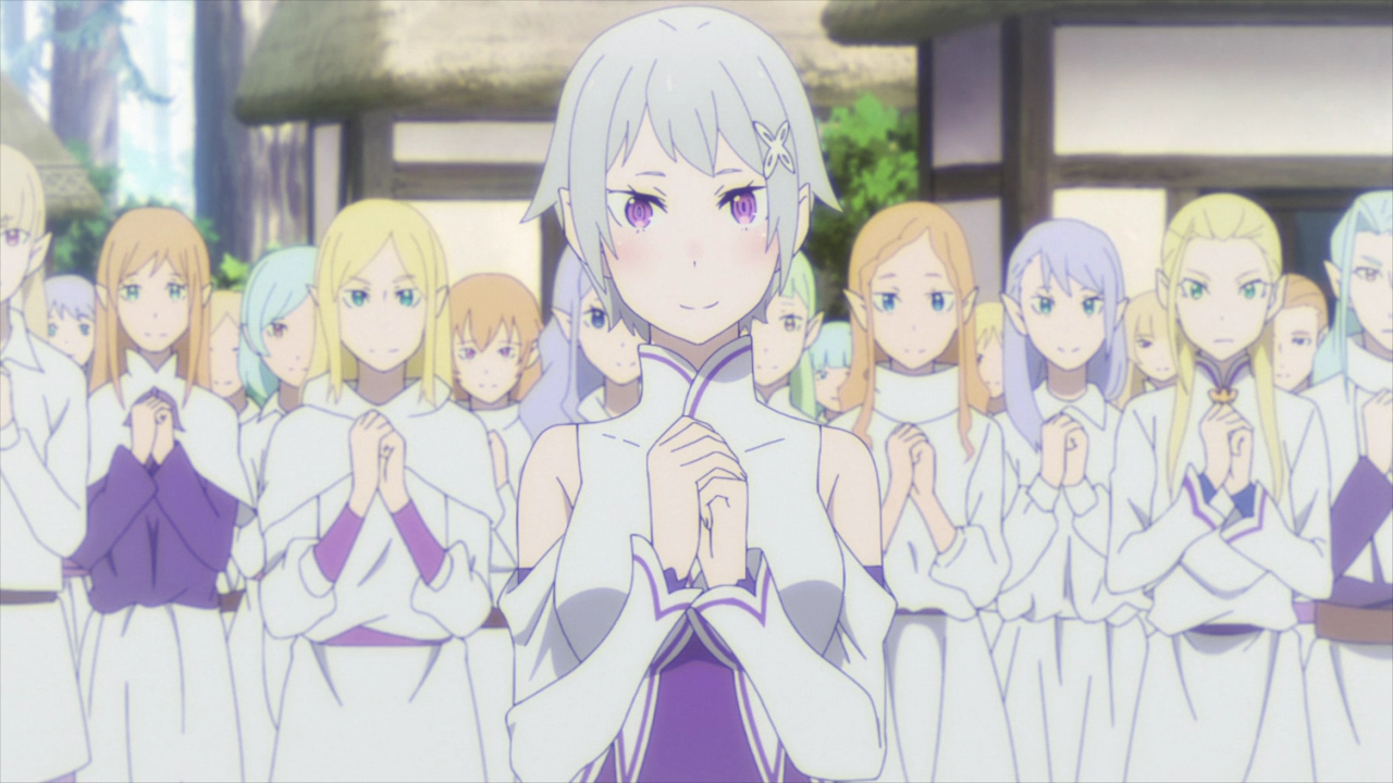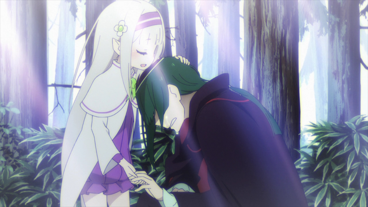 The elves live in this forest and Geuse’s group, the witch cultists, have a good relationship with them. They bring clothes and supplies to them regularly, and Fortuna and Geuse are a very close pair who have known each other for a long time (and kinda have a thing for each other, hehe). From the way Geuse spoke, it sounds like the elves were driven away from wherever they were before and had to live in the forest, but it seems like a very peaceful area and they have good relations with the witch’s cult. And this is in thanks to the art, but it’s a very beautiful and serene place. It doesn’t seem like there’s any problems whatsoever but it’s still pretty strange, as well as them mentioning that seal, and Emilia’s importance to it. Even though she doesn’t even know Betelgeuce (at the start), she already had some sort of relationship just from whatever is planned for her in the future. This is reinforced when they both meet for the first time and Geuce’s ends up dramatically crying in happiness, sort of revering Emilia as an important figure to him, like a goddess or something. It was a very strange moment that seems to be pointing to something, such as Emilia having some sort of connection with the witch cult, and a witch in general. And if Echidna’s words are to be believed, her mother being that witch herself, or just a witch. I didn’t anticipate Betelgeuse being a part of this, but Emilia’s connection with witches is just getting stronger and stronger. Basically, everything about this is strange and suspicious.