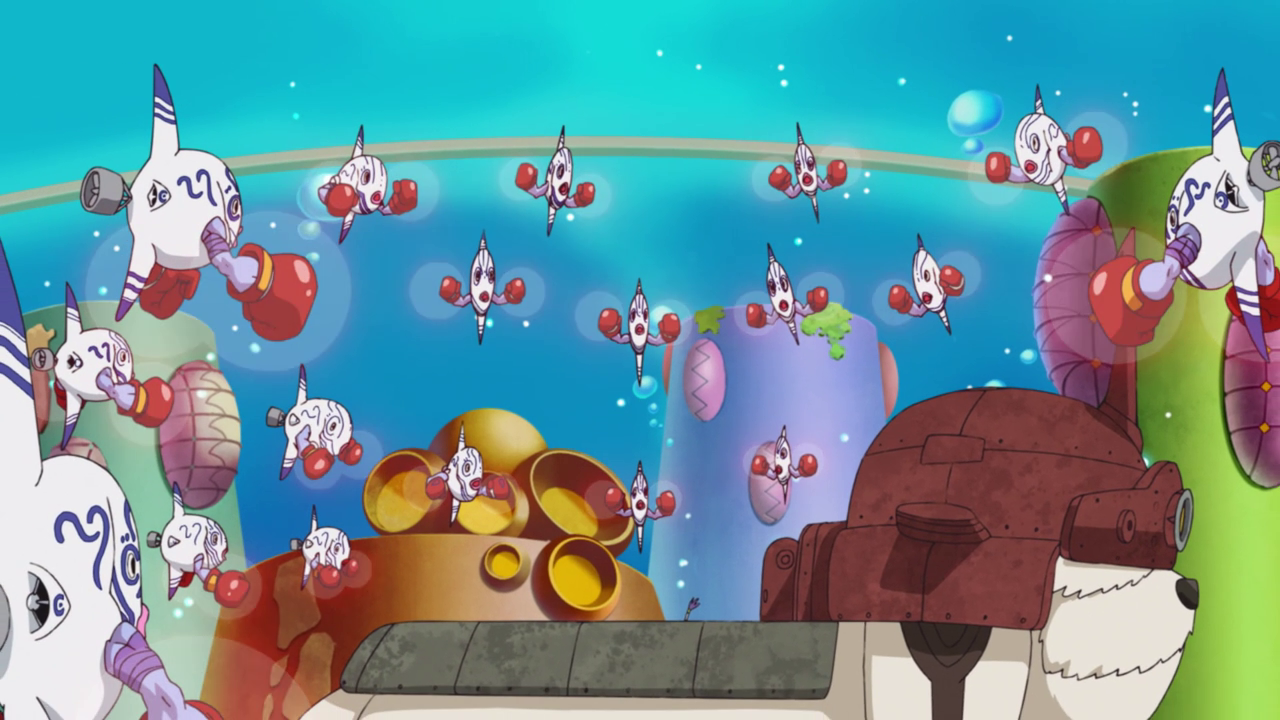 The kids find themselves in an underwater city after Komondomon took them into the ocean (to which surprised me that it seems to act as all sorts of vehicles and not just a pick up truck lol) on their way to FAGA where Millenniumon’s largest shard is located. And I’m sure that’s the place where all those alien-like Digimon are (whose name still escapes me). But anyways, while they were initially attacked, they were just on guard due to the ongoing turf war that has been going on with the Mantaraymon. And once they proved to be on their side, they find out that Marinangemon was the one protecting the city, another Holy Digimon.