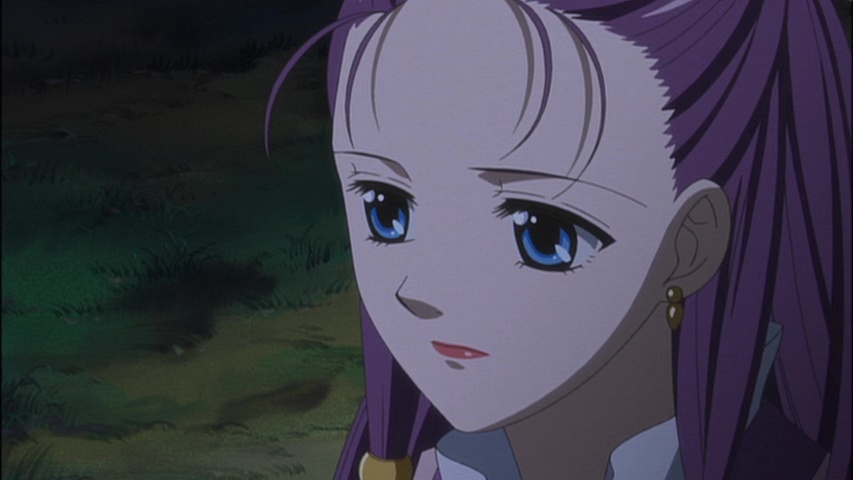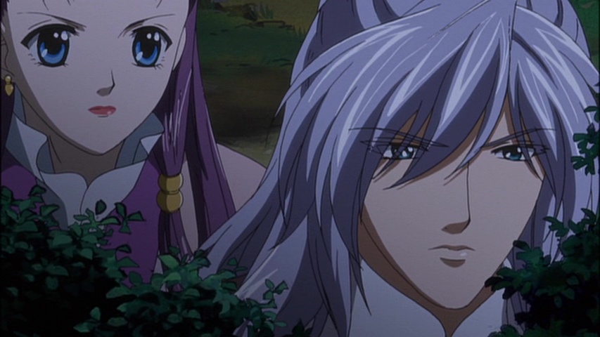 Shūrei approaches the guards, whom she thought would have left their post, and tries to push her way in. They decline to move out of her way and just when it seems Shūrei could really be in a lot of trouble, Shunki steps out from the woods and uses her magic to both command Shūrei to cover her ears (thus protecting her) and to make the guards unconscious.